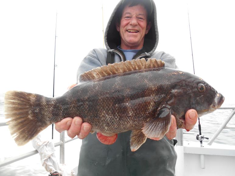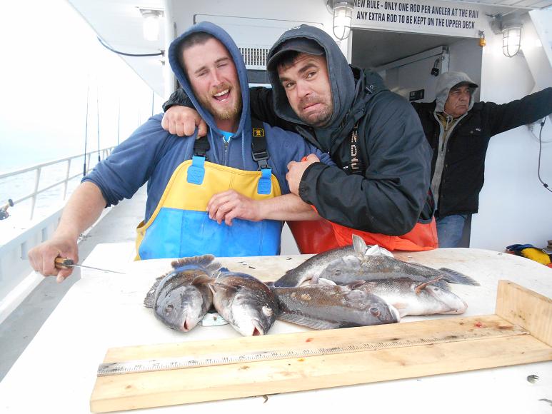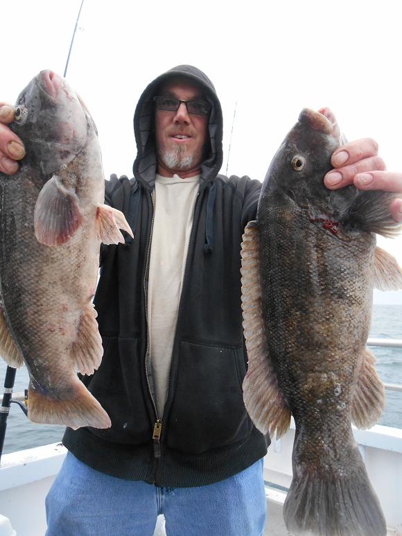 Hey gang, Capt. Scott here. We had dense fog all morning, plus we weren't able to get the anchors out with the floppy moppy conditions but for the last two hours we got the two out and we're banging away at some nice big tog. A few guys with limits, some guys with four or five and some guys with two or three. But we're putting in OT today, we'll be getting in late....whatever it takes. Capt. Glenn said he'll see you in the A.M. Pool winner and photos later. Thx. Capt. Scott Heated handrails, heated cabin, green crabs and white leggers.