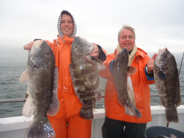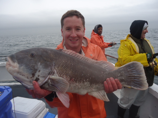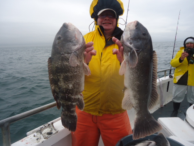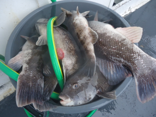 12-6-13 Rainy but warm,,,that changed by 10am..front came through and it was cold and wet,,nice size ground swell to but pretty calm for the most part.What I call perfect Blackfish Conditions..The weather kept most people away today,,only had a very small crowd show up to fish..Shame cause fishing was really good for some big blackfish...Guys had limits early in the morning and kept going..High hook landed 16 keepers,,another had 15..Alot of quality fish in the 4-7lb.range and pool fish about 9lbs...White leggers were key,,thats what they wanted today for the most part..Check out some pics..See ya in the Am for coffee..