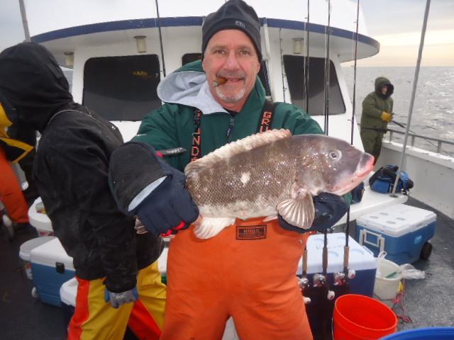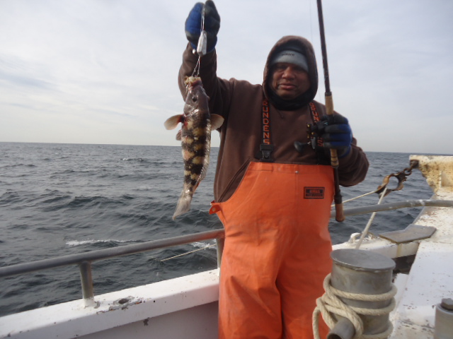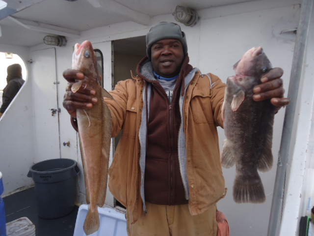 1-31-14 Last day of January gave us nice conditions on the ocean..Flat calm and nice again..little warmer to..Decent life on the bottom again,,,mixed bag of fish coming up on everydrop...Again plenty of bites,,just had to weed through the perch and eels and stuff to get into the better fish..Kinda like yesterday day around the boat you would see some nice blackfish come up and mixed in here and there like the togs you would see ling and even some codfish,...I know we had one keeper Cod today and a few shorts...So in the end I was happy again with the life and the bites we had,,,most went home some Lings,,or Togs,,or both..I think only a few had a tough day.Im not sure if a Cod or Tog took the pool yet,,we shall see in a bit@!.Check out some pics from today...TOMORROW AND THE WHOLE WEEKEND LOOKS REAL NICE WITH FAVORABLE WINDS....SEE YA FOR COFFEE TOMORROW...