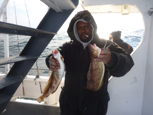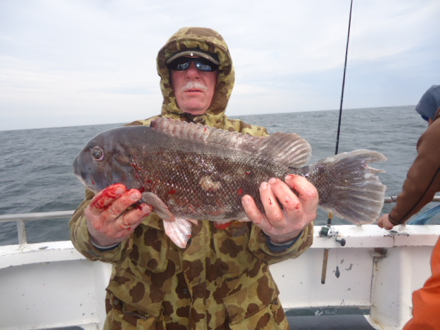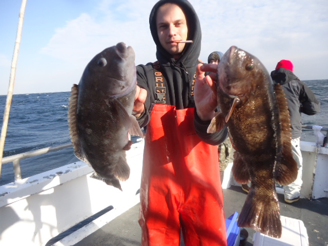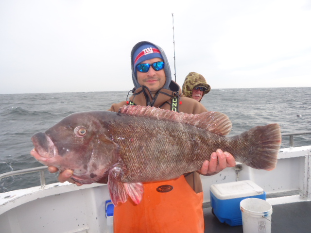 1-27-14 We made our way out in lumpy conditions this morning...the usual winter time stuff but at least it was warmer today..Still had that swell that I was hoping was gone but we dealt with it.The water in the river was 35 degrees,,,offshore on the grounds it was around 37.The ride was worth it and we got into fish quickly,,,granted it was not the easiest day to fish with the big swell but some guys got dialed in with the Togs,,,some nice ling and a few small codfish as well..In the first picture below Pete Bonilla got dialed in early on with this really nice fish that at first when I saw him swing and set the hook I though was a small fish but with the boat riding high on a swell when we went down and came back up I saw it had some weight...It looked really big when it came up in crystal clear green water from way down,,it looked over twenty pounds...We got her to the net and while not as big as it looked underwater it was a really nice fish weighed in later on land at just under 15lbs..Dj fished as well and had a few other nice keeper Togs as did some others,,no lack of bites just difficult to fish in today..Again some soft baits,,,clams or shrimps tipped over a crab worked well..Actually we had some keeper Togs on the Ghost Shrimps that we use for the Lings,,,,Chartruese Gulp Shrimps that is anyway...I look forward to heading back offshore again,,, we are fishing everyday unless I say the trip is canceled here on the webpage like tomorrow....tomorrow is canceled due to the extreme cold and high winds....Wednesday we shall head back out and it looks like everyday thereafter until the next nasty day..I still have crabs and we also have clams for bait....Remember I have said it before that this is the time of year when we might not catch as many fish as usual but we usually catch our biggest fish of the year when we start fishing deeper so no need to sit at home,,come on down and get in on the action...The cabin is always like Key West!!!Check out some pics,,see ya Wednesday..