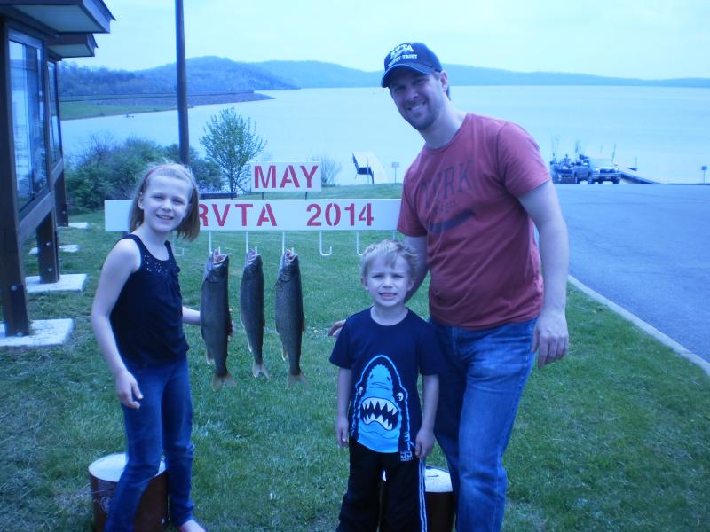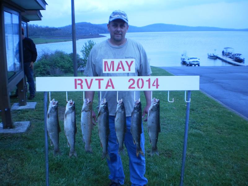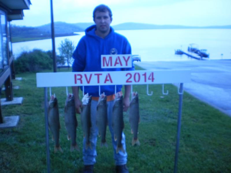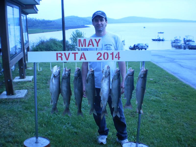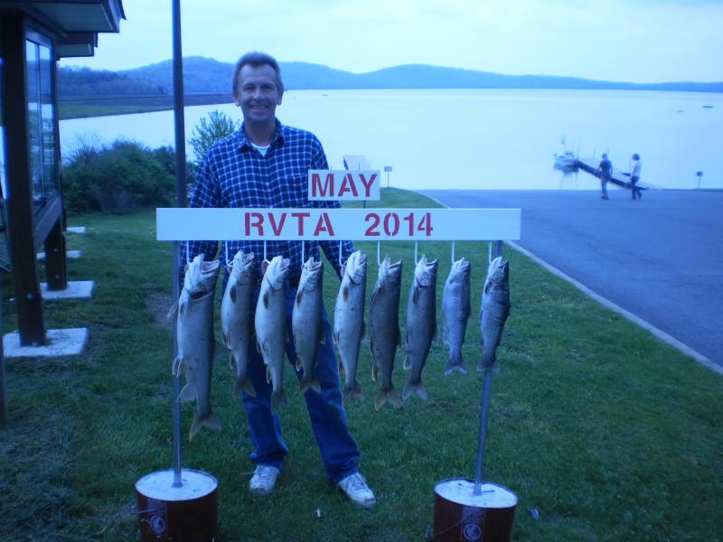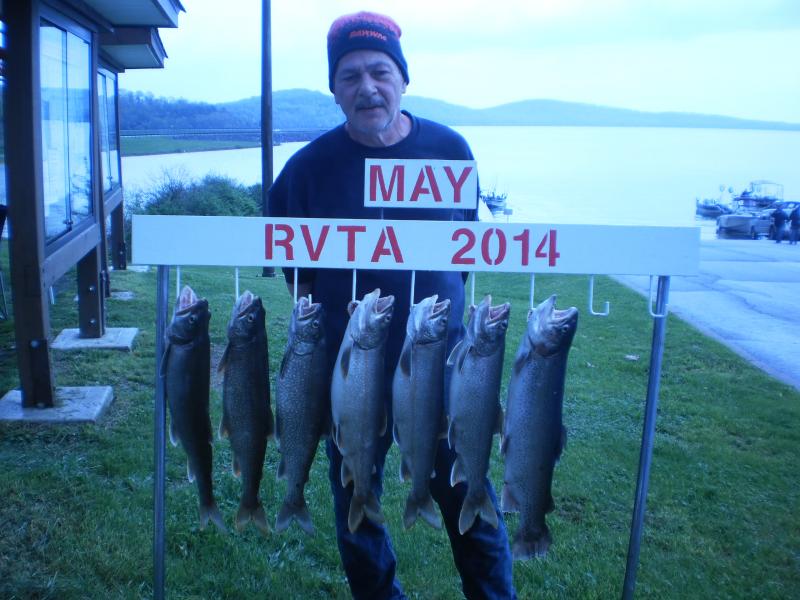 May 10th RVTA tournament. It was a little foggy out there Saturday morning but the fish didn't seem to mind. Check out the smiling faces and the heavily laden fish board in the pics below and the story tells itself. Well almost. Twenty-eight fisherman weighed in a total of 102 legal trout, mostly lakers. Now that's fishing. And I'd also like to say to all you fisherman that the state is encouraging the taking of a legal limit of lakers, because of a lot of reasons the fish aren't attaining normal growth rates. The Steve Welgoss tournament is this Saturday May 17th, don't miss it. For the details go to the RVTA website.