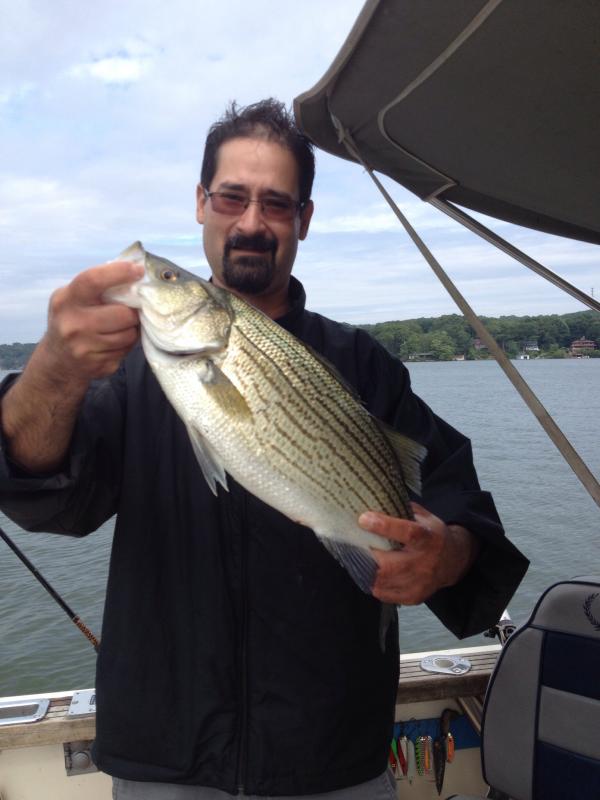 Had no love from the herring today, other than a couple crappie. After 3 hours of killing alewives and moving around, I decided to bring out the big guns and do some trolling. Ran the outside lines on dipsy divers pulling walleye spoons, the inside lines with deep diving stick baits. The spoons picked up 2 pickerel, a short walleye and this beauty of a wiper. Nothing on the stick baits. My buddy was happy with his b-day present. |