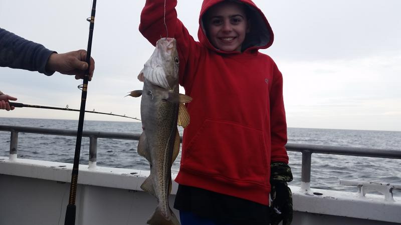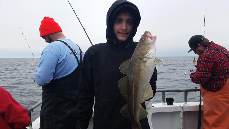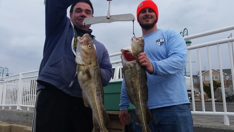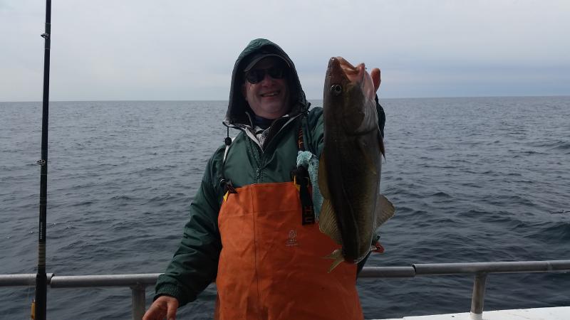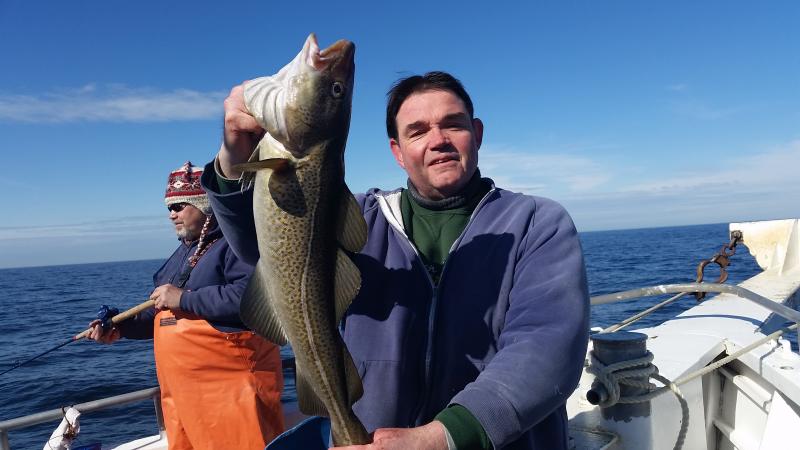 3-31-15 Really nice day offshore today,,flat calm for the most part...A little bit of a ground swell but not to big..After the wind completely died out the boat was all over the place..Made it tough to sit still and I think it hurt our fishing a little bit... We caught some fish but it was slow,,,,even though our high hook had over a dozen codfish,,,3 of em keepers and a keeper pollock it still was slow overall..Fish were caught yes but mostly by the guys casting out and around working the area....Darker colored gulps,,,the fish are spitting up baby sea bass seem to be working well lately....keep that in mind...Any way it still was a nice day with a great group of people and even a few kids who caught a keeper each!!!!pics,,tomorrow looks nice...look forward to getting back out there...see ya for coffee.