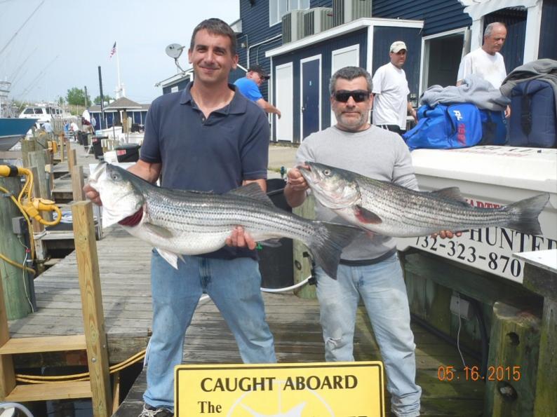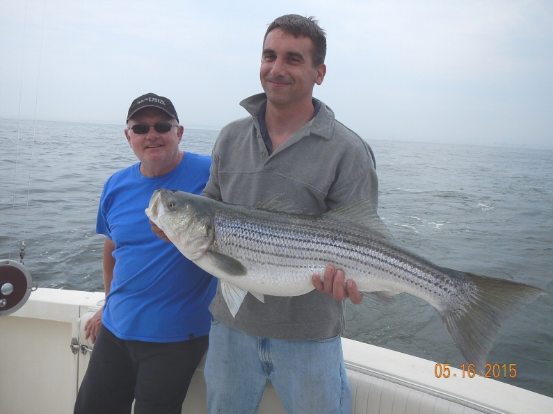 Long Time supporter of the Bounty Hunter Chris Cameroni was on board today. Rounding out Chris's crew were Pete, Carmine, Peter, Tony & Jack. With the south wind lasting thru the night Paul decided to head north in search of warmer water. Water temps were 47 to 49 degrees on the ride north but we finally found the 57 degree water up in the Bay. We put out the Spoons and our first fish was a 36" Bass landed by Tony. After that the Blues came on and you could troll all the Blues you wanted. The guy's trolled over 3 Dozen big Blues while keeping 16 and releasing the rest. Our "Whistle" fish was a nice 39" Bass taken by Pete. It was another good day with a great crew.