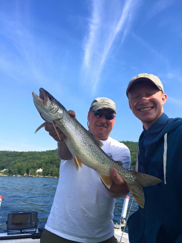 My family and I go on vacation to Lake George every year and stay at a cottage right on the water. Was out fishing for at least 3 hours every day on my small boat, unfortunately the fish weren't very cooperative. Smallmouth were much fewer and far between than in years past. I can probably count how many I caught that week on my two hands. All of them (except one) were around 12-13" so nothing special. The only large one I caught was right around 1.5 lbs but I didn't get a picture of him. Other than smallmouth fishing my grandfather, father and I took a charter out for lakers and managed only one 22" shorty. Was my first ever Lake Trout so I'm still pretty happy. I'll post the picture despite me not being able to get a grip on the fish and blinking in the only photo taken (My dad's a fantastic photographer ). The highlight of my week there, though, was when I discovered a beautiful native brook trout stream in one of the most unlikely places. I won't be sharing where it is in order to keep it pristine. I managed to catch about a dozen little 4"ers as well as an 8". Also had two strikes from fish in the 10-12" range. And this was all while fishing for maybe about an hour. Great vacation in my opinion, but I still wish the fishing was a little better!