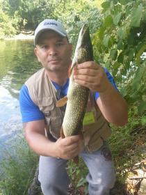 I had such a good time at the river yesterday that I went back with my buddy and hit a different stretch today. We fished 8:30 to 11:30. I landed a 30 inch pike and two smb. My buddy got a channel cat on a live shiner w a bobber which I have never seen a long with a pike. Also spotted a nice blue her on along the way. It felt great to be out two days in a row ad catch some fish.