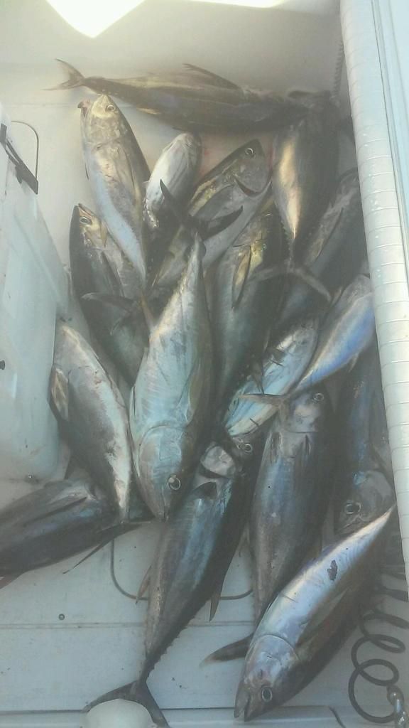 headed up from the shore sunday night and got a last minute call to go offshore for some tunnies. wife wasnt happy but oh well, got my stuff 2gether after sitting in traffic til midnite to get home and grabbed 3 hrs sleep and headed back down the shore w Mikey. Made our stops for last minute jigs and grub and out of the slip around 530. After a 3+ hr steam offshore about 80 miles or so we got to the grounds. searched on the troll for a while and we saw some life and began to jig em. I struck first blood and pretty soon the whole crew was on them. we had 3 good shots at them, w the last spot being insane. everyone hooked up w a chunk slick going and falsies and albies all over the topwater bite. It was fish on, fish off, fish on, and so on for a solid hour w mayhem. with our arms tired we kept our boat limit and made the long steam back in snotty 5-6 footers for another 3+hrs. beat tired but so worth it, too much action to take pics while it happened, heres the result.........sushi for everybody haha