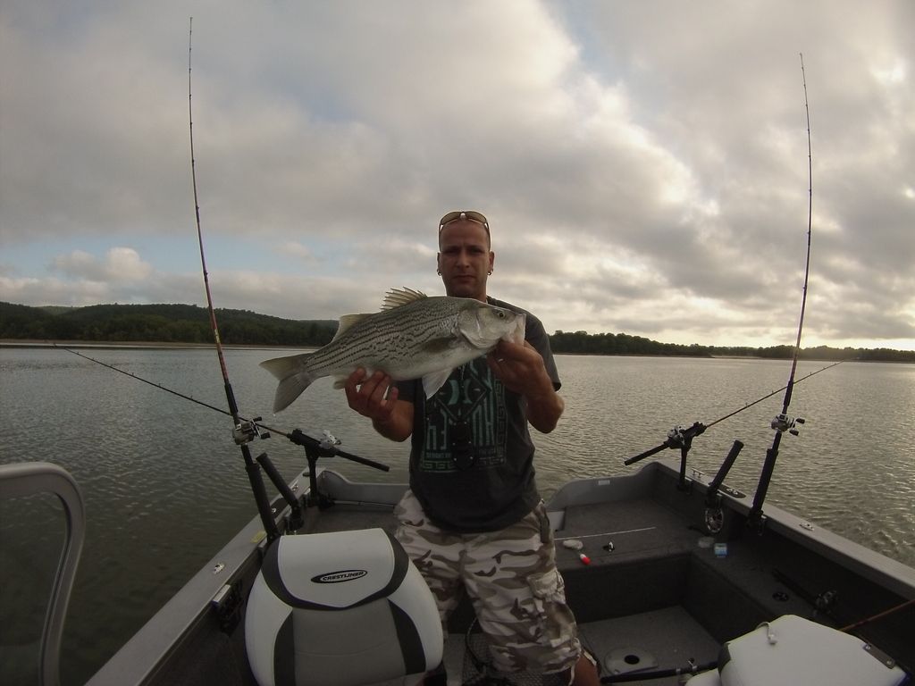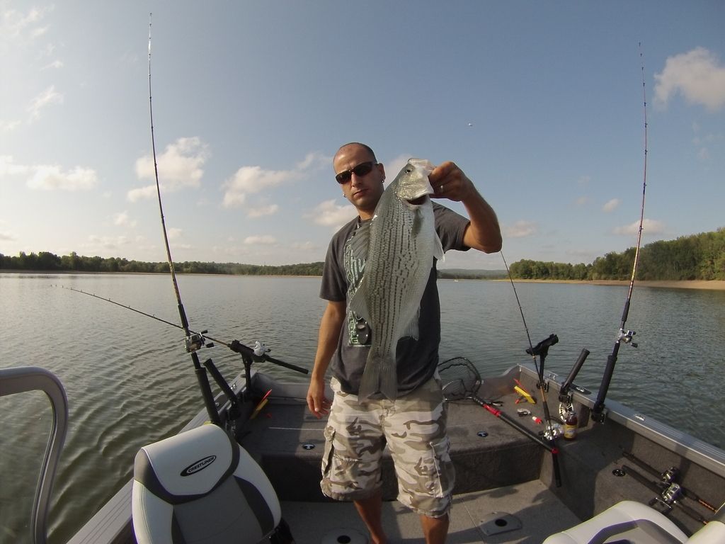 headed out early to get a morning quickie in before heading to the shore. got bait just after 6 and met Zach for the first time, BS'd for a bit and headed to the water. after a crappy launch situation I got moving and scanning the sketchy water looking for life. Headed to where I left them last and in the area I got a glimpse of some insane marks. Started setting up a spread and got nailed setting the 4th line in w 4 hookups, managed 3 of the 4. After that I just ran 2 downlines and fought singles and doubles til 10am when i ran out of bait. they ate anything I had, dead spinners, half eatens, didnt matter. Lost a nice 30's class pike boatside that worked thru a 15lb floro leader, all the rest were hybrids, I think 22 in all. Had 2 nice fish at 24" the rest were all low 20s fish, only 1 rat for the morning. Thanks to Zach for the couple extras, I actually needed them haha........pics to prove it