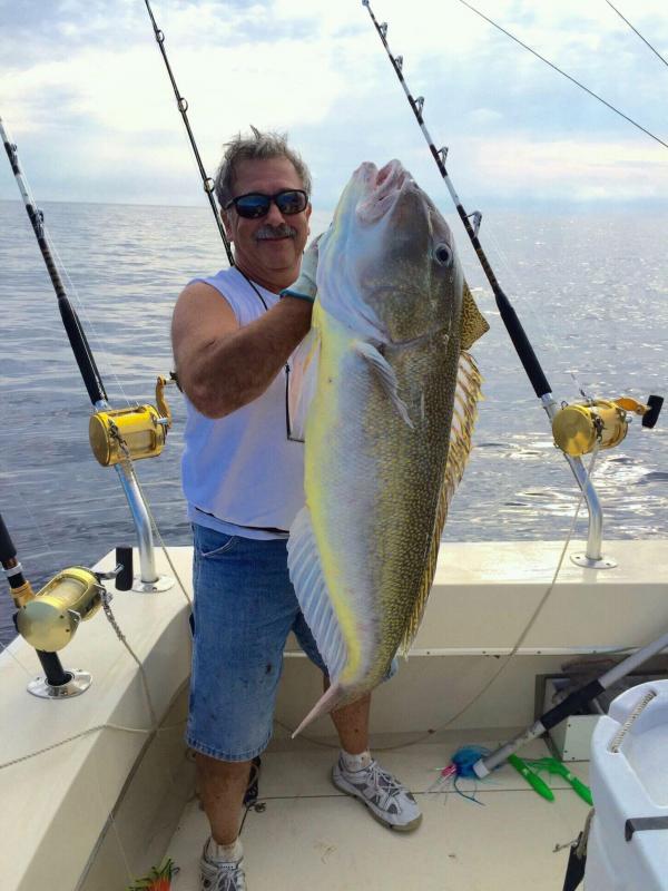 My fathers report: All day troll east of Hudson. Nada. 2 hours into the night trolling, nada. Founds whales, set up to chunk. 2 am first fish... managed 5 from 2-3 am. 55-75 lb yfts. All taken on butters.Then shoal of mahi so thick you could walk on came into slick. Couldn't get bait past. Tried jigs to no avail. Tuna gone. Boxed nice mahi to 15+ lbs. Not sure how many. False dawn, back on troll. Headed further east. Nada. Stopped to deep drop for tiles in 600-650'. Boxed a nice handful of fish including the attached 49 lb'er.