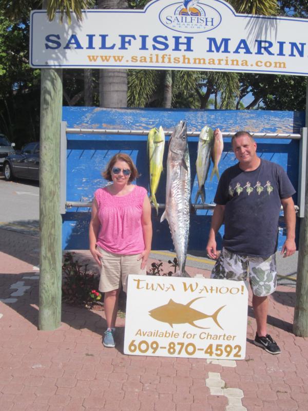 I had Wendy and Mike Hill out today, a more fun, enthusiastic, generous couple you will not find ! We worked our way north and kite fished and bottom fished at the same time, the breeze today turned on the fish and we got bites on all of the rods. We ended up with a couple of mahi, yellowtail snapper, runners, and a 58 inch 41 pound king. Action packed 4 hour trip. Tight Lines –Rich