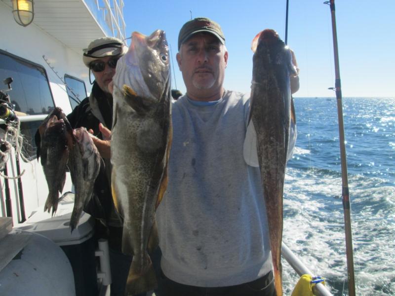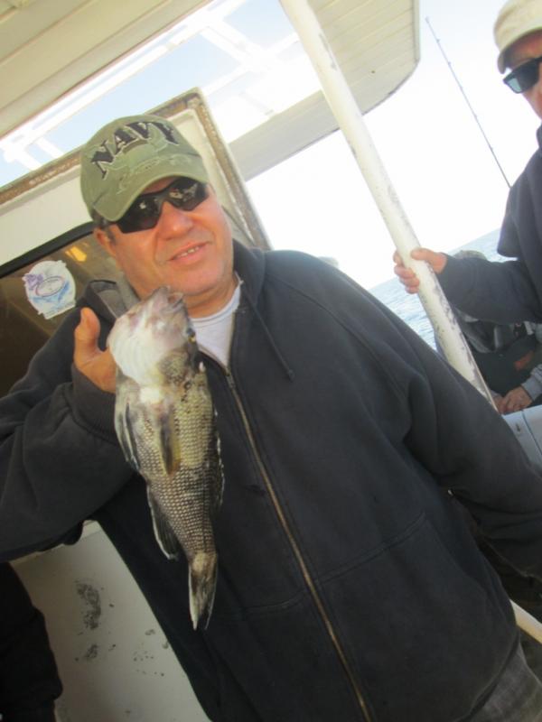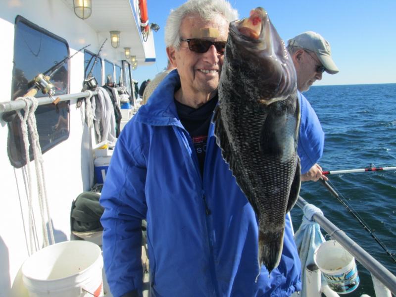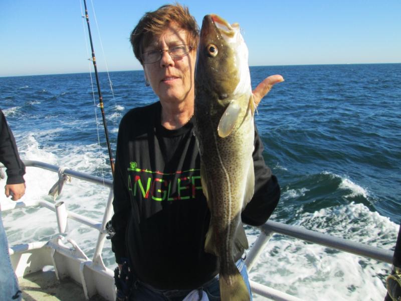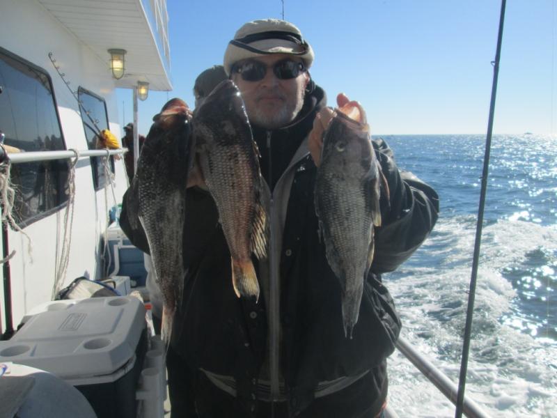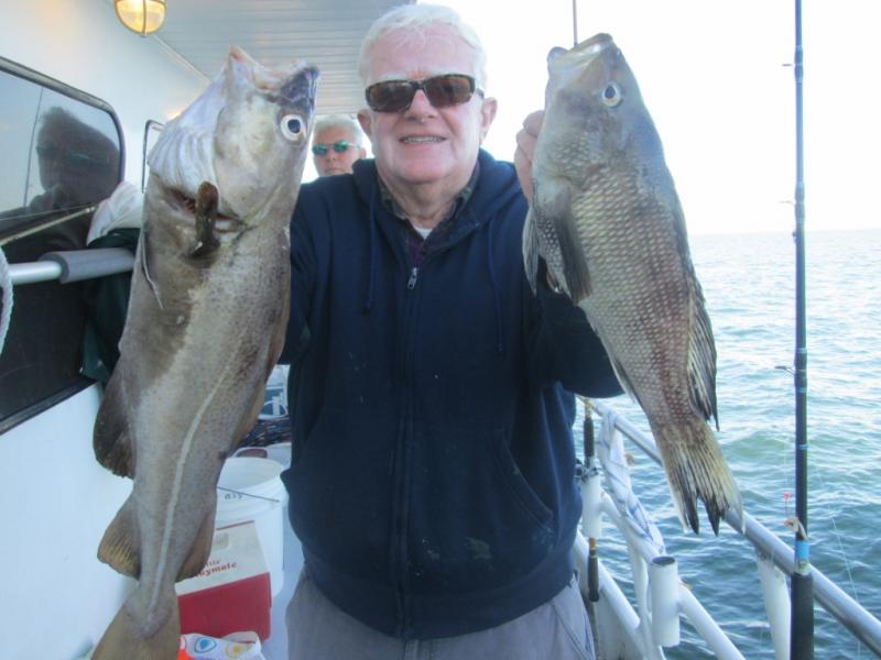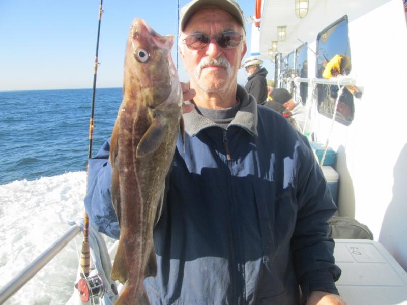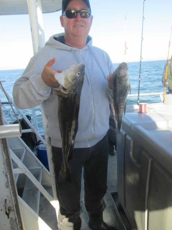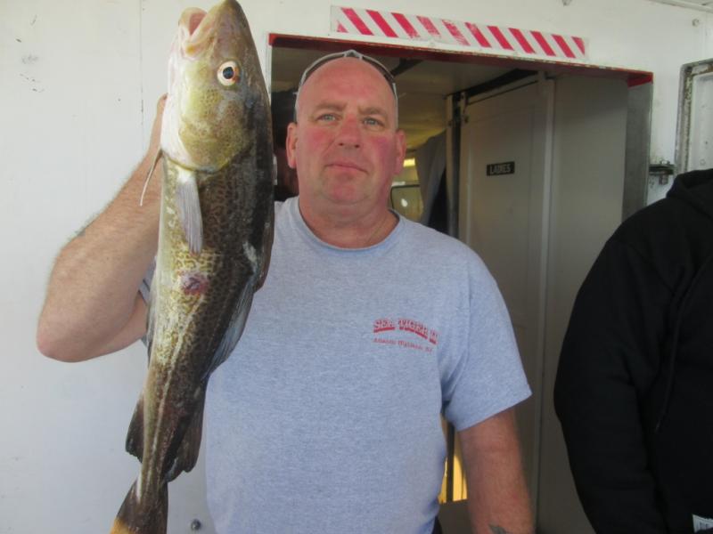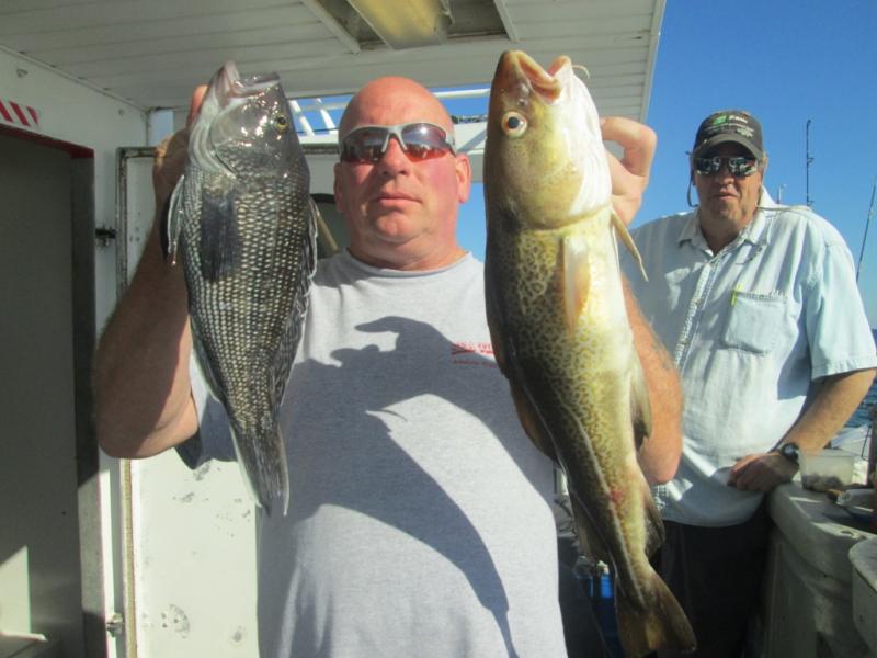 I didn't see the amount of sea bass I wanted where we had them offshore Saturday so I went to deeper water and was surprised by the amount of keeper cod we caught. The cod saved the day for a lot of anglers today. We also had some nice ling mixed in. A couple of drops had the dogs. Most of the sea bass were quality fish and only a few porgies. The sea bass and cod were full of crabs. Jimmy Salmon from Union had todays pool with a cod. The weather looks good again tomorrow.