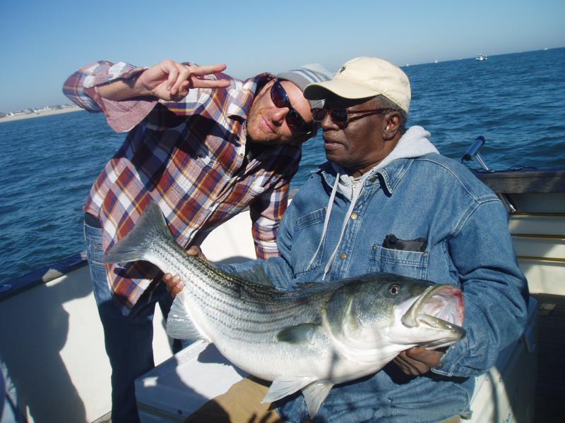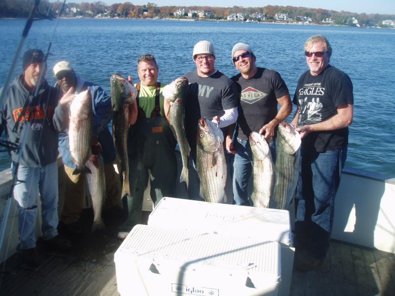 Planned to take Jarrett Teller and friends from Wayne Pa to Sandy Hook for a day of Striper fishing but turned right at Manasquan Inlet based on the chatter. Joined a fleet at the thunder bird and began snagging and dropping with no results. Set out the spoons and began picking 25-28 lb stripers in 30 feet of water heading south. The charter caught their under limit by 1pm and we headed home with smiling faces. Hot area was between the Lavalette and Ortley Beach water towers. Hot lure was white Maja #4 spoon.