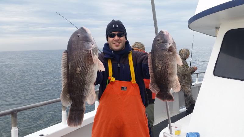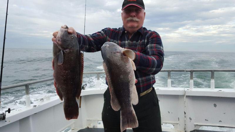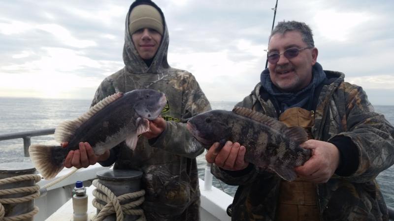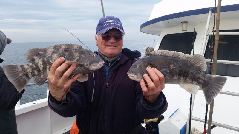 2-1-16 The big ground swell was still there today,,not rough just hilly.... but the fish had the feed bag on...We did really well for a averaged sized group of anglers with everyone going home with fish,,,High hook had 12 keepers only keeping his limit,,,good day all around and we are heading out again tomorrow...They chewed both greens and white crabs today,,we have the greens and the tackle shop has whites if you want them..see ya for coffee..pics