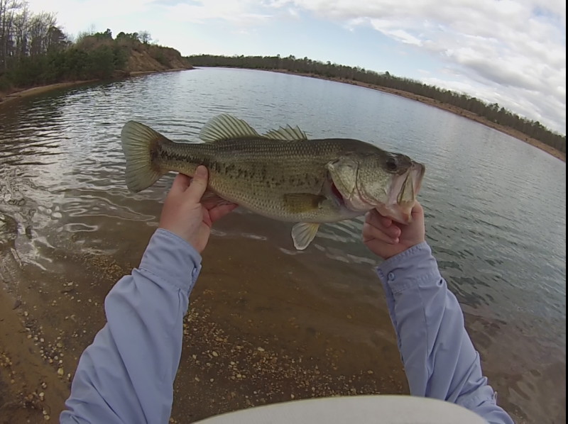 I found a pond on Google Earth over the winter that I have wanted to try for a while. With a lot of bass now moving up shallow for the spawn, I decided today would be the perfect day to scout it out and see what was going on. As soon as I got there, I started seeing tiny bass in the shallows. They were everywhere, tons of them! Only saw a couple of larger fish however, and getting them to bit e proved to be a challenge. I worked around nearly the entire pond, catching about a half dozen bass (and one behemoth sunfish), none of them over a pound, an most not more than a few inches long. Eventually I found a log in the water, the only piece of real structure I had seen all day. First cast with a lipless crank, and something hammers it! A 4-pounder rocketed out of the water, and after a brief fight I was able to land my biggest largie of the year so far.