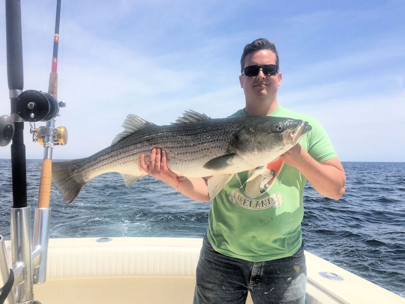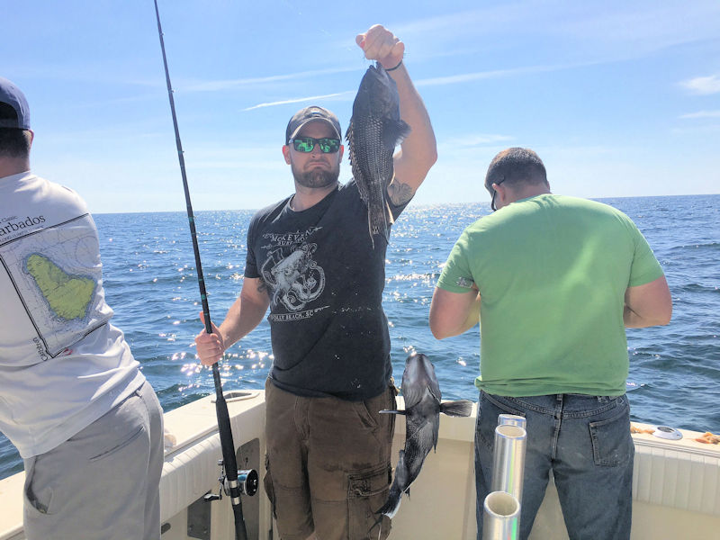 Paul had the Tom Raymond crew from Betty & Nicks Tackle on board today. Along with Tom were Dan, Bryan, Justin, Nick & Hal. Paul worked a few drops today and each gave up some nice Seabass. It took a while but the guys put a boat limit catch on ice. With some time left we moved back inshore to try for a few Stripers. We missed the bite but did manage to put one 30# Bass in the box. Another great day with a great group of guys and we enjoyed some beautiful weather.