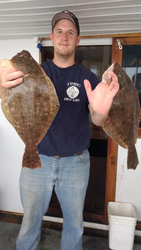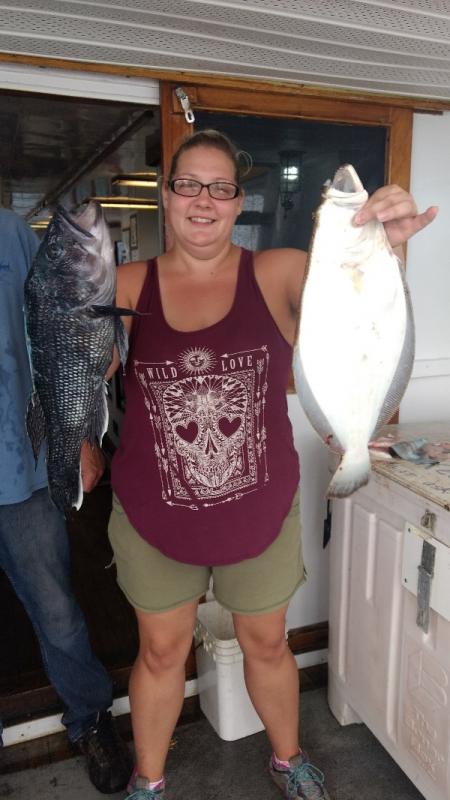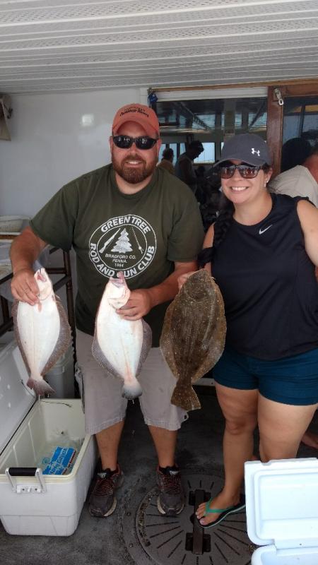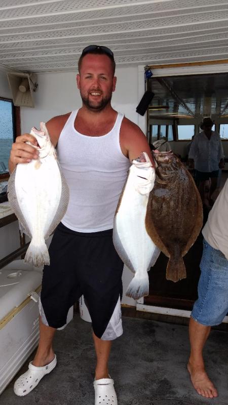 Hey guys we're still doing well with the Fluke. You need to come South and get in on this excellent Fluke fishing aboard the Captain Cal. We have had a lot of limits of Fluke and lots of Sea Bass coming over the rail the last two days. Non stop action all day long! Jazzy and Greg tied for the pool on Friday with a pair of 4.5 lb. Fluke. Today Carol and Cheryl took the pools with a 3.5 and 4lb. Fluke. That a boy ladies! Way to show the guys how to do it. I have to mention the New Palz, NY firefighters who were on the boat today. Great bunch of guys. Thank you for what you do! We sail everyday from 7:30am - 2:30pm. Tomorrow looks like it's going to be a nice day so come get some!