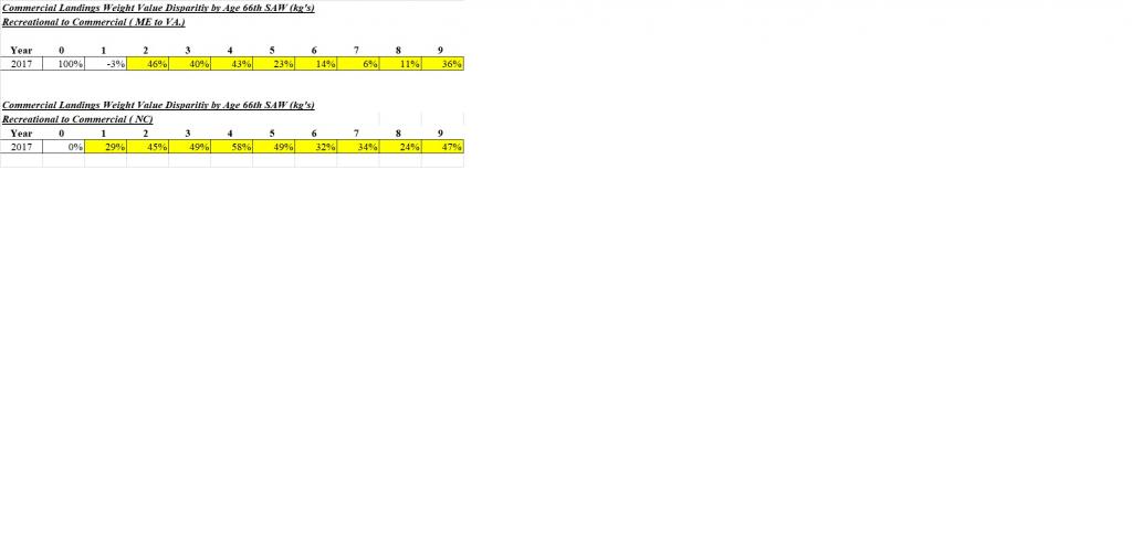 As many have said in prior posts, we’ve had south winds forever. The frequency of south winds is what’s changed this year but the Jersey Shore and south winds have always gone hand in hand and it no doubt effects the bite. Years ago, they usually came up in the afternoon coinciding with rising air temperatures throughout the day. This year they seem to be an all-day occurrence and for weeks on end. I remember years ago fishing the Long Branch pier when we’d be hammering fluke of all sizes every cast. If the wind shifted to the south, the bite stopped immediately as if someone hit a switch. The impact can be that extreme and happen that quickly. I’ve seen it too many times to believe it’s a coincidence. BUT with that said, if shorts are feeding, larger specimens should be as well. The problem we’re seeing is the older age class groups of this stock have been pounded far too long, regulations have caused that portion of the biomass to materially decline and there’s no stock that can sustain itself under those conditions as recruitment levels are destroyed which is what we’ve seen over at minimum the last decade. Fish are still being caught. Problem is with continued emphasis on harvesting 18” and larger fish both commercially and recreationally, the stock has gone through a transformation of age groups and gender composition. On water studies support both and aren’t disputable. The biomass overall has declined otherwise we wouldn’t have seen a decrease in commercial quotas this year from 15.5 million lbs. in 2023 to 8.8 million lbs. in 2024 or a 43% decrease. Half that commercial quota is allocated to Virginia (1.8 million lbs.) and North Carolina (2.4 million lbs.) who harvest almost exclusively during the fall / winter months off our coast. That decrease in commercial quota alone should concern everyone as that sector has always received preferential treatment in the management of this stock so if they’re taking that degree of a haircut from NMFS, what does that tell us about the overall health of the fishery. When conditions are more favorable, you’ll see fish caught but the biomass isn’t there anymore. That’s a leading indicator a fishery is in decline and coupled with the fact the larger age groups are disappearing from the stock for multiple reasons, this stock has a limited and bleak future. We can talk about the impacts a slot, size slot, the fact the last two year NJ had a ridiculously thin 17” - 18” slot, which by the way tremendously helped party and for hire vessels, may have led to the elimination of an age group but I don’t agree with that theory. As far as I know, NJ is the only state that implemented a slot. NJ has approximately 23% of the recreational quota and if we think the NJ slot based on those numbers killed an entire age group, I disagree that two years for one state with a slot and a 20% portion of the recreational quota would have that dramatic an impact. At the same time, if you adhere to that theory, you'd have to agree for the same reason that harvesting 18" plus fish since 2008 due to size minimum regulations has had the same impact on the mega breeders of the stock. Look at the below chart (first graph) which I’ve posted here before. Black bars are on board federal observer percentages of commercial discard to landings, even though it says catch. Blue bars are percentages from operator’s VTR (Vessel Trip Reports) to landings which operators are required to provide every trip on an honor system basis. They can put any percentage on the VTR they wish and its completely unsubstantiated. Chart was from the 57th stock assessment and removed from every stock assessment since because of the picture it paints about the waste commercial netting causes in this fishery. In 2006, 2007 and 2008, dead discard was reported by independent observers at 85%, 145% and 95% of landings. Commercial landings (in lbs.) for those years were 13.9 million, 10 million and 9.2 million. That means for those three years alone if NMFS used their own observers discard percentage statistics for dead discard mortality as opposed to arbitrary VTR percentages from commercial operators which you know are intentionally understated, the commercial sector killed 11.8 million, 14.5 million and 8.75 million pounds of less desirable fish or 35 million pounds in total to harvest 33 million pounds. More than 100% discard mortality in the harvest of their allowable quota. If the fish discarded averaged 1.5 pounds, the future of the fishery, in three years the commercial sector killed 23 million fish in the process of harvesting 33 million pounds of higher value fish! Notice how the range changes between blue and black bars in 2000. Why? Because when size minimums started being used in the recreational sector to handicap recreational harvest and ultimately push 14” to 18” fish to the exclusive harvest of the commercial sector, commercial operators started harvesting those larger more valuable fish and killing the younger age classes caught in their nets. It’s called “selective harvest” and it will always result in substantially higher discard rates and waste in any fishery. A table I created from stock assessment data (second graph) used to set and manage quotas is attached depicting weight assignments of fish. Most people never get to this level of understanding exactly how the recreational sector is being screwed and the fishery itself is being mismanaged. The table shows unexplained weight disparities of fish caught commercially versus the same age class weights assigned to fish caught recreationally. There's two parts of the analysis, for some reason NMFS assigns different weight values to fish harvested commercially from Maine to Virginia than they do for fish harvested by North Carolina. What makes this disparity even more ridiculous is North Carolina is harvesting almost 100% of their fish from our local waters and weights should be identical to recr