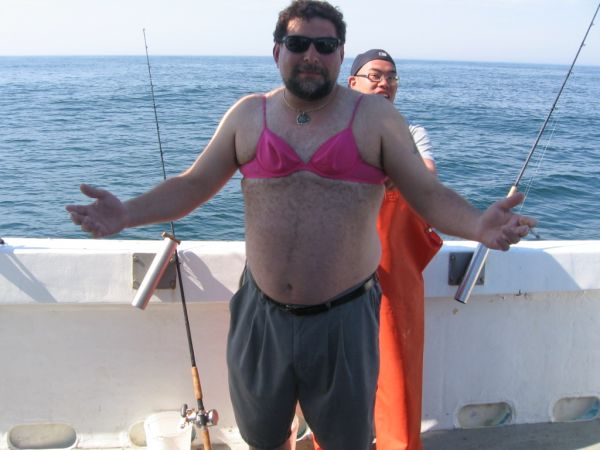 I had my shrimp and Paulie had his hermits, as soon as I get on the boat Paulie comes to me and says "here's the bet, Hermits Vs. shrimp. high hook wins, the looser becomes the bitch and must wear Kim's bra for website photos." Thats right I lost! and being I am a man (or bitch) of my word, the results are attached. Parental guidance suggested As for the day on the Mimi it was too nice! no wind and very hard to anchor, Kenny kept us out way late trying to get them to turn on. we tried many different depths and locations, but it just never happened. very fun day, with a bunch of nice peeps, and one ugly transvestite. I ended up with 5 shorts, and a handful of nice seabass. Paulie had two keepers, but all he need was the first 14.0001 inch fish to win the wager. I demand a rematch. Kenny and Chris are the best, going to try to get out once more this week before it closes. enjoy the pics