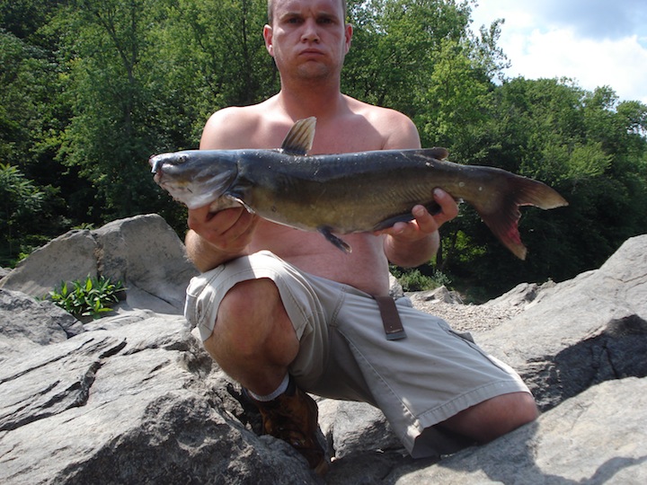 Hit the big river for a couple hours today. Fished from 1130-130, fishing off the rocks launching giant nite crawlers into a 35 ft deep hole. Spots real popular with the locals, its a swimming hole but it also holds channels, flatheads, stripers, walleye and other creatures of the deep. Its the DEEPEST stretch of river in this area. Just felt like dead sticking today so thats what I did. Managed to get up 1 healthy CHANNEL CAT at 6lbs. 23 inches long. This was a FAT LIL KITTY considering he was only 23 inches. There was another group of guys there fishing chicken livers, they caught small channel cats and stripers 6-10 inches on the livers. This spot is AWESOME at night!!! I must add that I had 2 other run offs but missed em, oh well, thats fishing. Do you know where I fished today??? GOOD TIMES, TIGHT LINES!!!