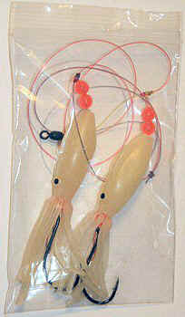 These are all hand-tied rigs using 50 lb quattro camo leader and gamakatsu hooks--the seabass jig rigs are deadly little killers!