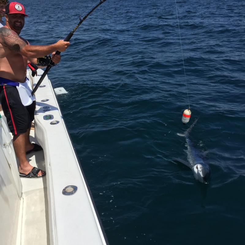 Plan was to get bait and go from there netted our bait and tried for the elusive Stripers just blues which turned out to be bait for later in the day. Hit a wreck For a couple dozen seabass and went into big game mode. Kids really wanted to see a shark, first drift Joe Sr. landed a nice 6 foot blue shark, kids were in awe. Now Joe Sr. wanted to tangle with something real big, set em back out and we hooked a 200lb Thresher, Joe and Jared took turns on him till we got the release, the look on the kids face after seeing the shark priceless!