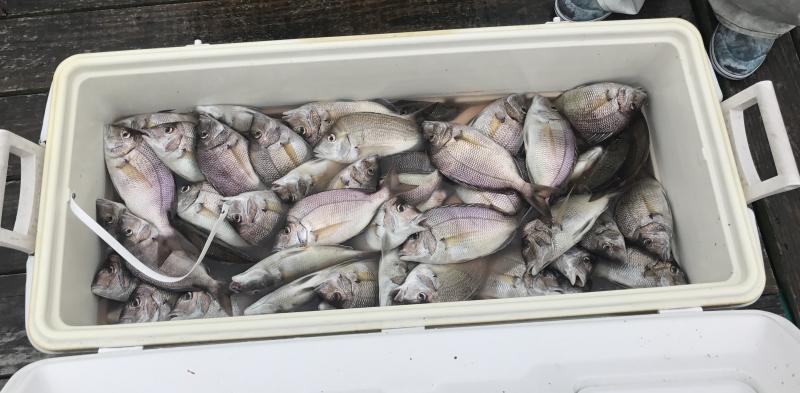 Had out capt ed today for his birthday along with Shawn and Eric. Only took us 2 areas to find where they were hiding and it was game on after that. Only dull moment was during the change of tide. Weather held out for us, including rain, until it was time to head in. Easy boat limit today so we were able to keep bigger ones and toss back the 10 and 11 inchers. Also had a bunch around 18 inches which was a nice surprise. Next openings are Friday 8/11 for fluke, 4 spots left