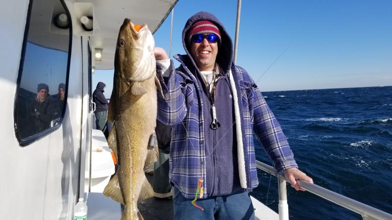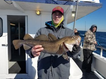 3-24-18 Very nice day offshore today,,,had good bottom life with a reading of 40 degrees on the surface...The perch were chewing for sure...hitting your bait as soon as you were on bottom...Picked at some nice Codfish today,,not alot but maybe a half dozen keepers...some shorts to ....Few pollock,,,and a ling...Some dogfish but not to bad today....Few of the Codfish were nice,,, 12- 15lbs maybe...Nice day to be out for sure either way...Unfortunately we have to cancel tomorrow..Gusty northeast winds will make the ocean pretty nasty so stay home tomorrow..Let you know the next nice day to go here...see ya then..
