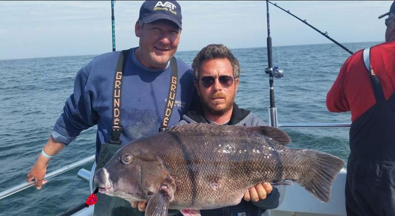 My favorite rig to use is the Belmar Rig. It's effective, easy to tie and no additional hardware to loose, like swivels, 3 ways or sinker snaps when you get stuck on the bottom. Join your braided line to your mono top shot using a Uni to Uni or Alberto knot. I prefer the Alberto knot... Easier to tie and it has a lower profile than the uni so it goes through the rod eyes easier https://www.youtube.com/watch?v=J56O3CZVu7M . I'm using 65 pound braid and a 40 or 50 lb mono or floro top shot. Blackfish are not line shy so no need to use light leaders. I like to make the mono leader longer then I need, usually around 7 to 8 feet so if I break off, I can use the remaining leader to tie another rig. - Take the last foot or so of your top shot and double it up with a double overhand knot at the top. Put your sinker on that loop. - Make a loop in the doubled line 3 inches or so above your sinker. Thread a pre snelled hook with a pre tied loop on to that loop. Now take your sinker and the line and tie a double overhand knot around your hook loop to keep it in place. I like using a stiff leader for the hook leader since it helps keep the hook line away from your main line and tangling back up on it. I like to pre tie hooks and leaders so when I do break off it's one less thing I have to tie. I snell the hook and a tie a surgeons loop for the loop end. Make the leader 7 to 8 inches long. Now on to fishing..... First rule of thumb is keep your sinker on the bottom and as still as possible... Although these fish are not line shy they are skittish and almost never hit a moving bait. For this reason you want to use a sinker that is going to keep you on the bottom and add another ounce or 2 for good measure... If you can hold bottom with 4 ounces, use 6 etc... Next, if you are in rough seas and the boat is bouncing around, you need to raise and lower your rod tip with the heave to try and keep your sinker from moving around. Now that you have that down, on to the next tip.... You don't want to be fishing a tight line and swinging at every little tick.... You're not waiting for a bite, you're waiting for the right bite... Best way to describe the feel is a thump, not a tick... If you are fishing tight to your sinker, you're going to feel every little tick... If you have a wee bit of slack in your line not only will it keep your sinker from moving around, you'll feel the thump, and that's what you want to set your hook on, not the ticks... Hope this helps some of you new to Blackfishing and feel free to pile on here. A little eye candy for yah... Brother Joe's personal best at 21 pounds and change caught on the Fish Monger here in NJ. I photo shopped in the jig just to mess with him and Captain Jerry. The fish was actually caught on a Belmar rig ![]()