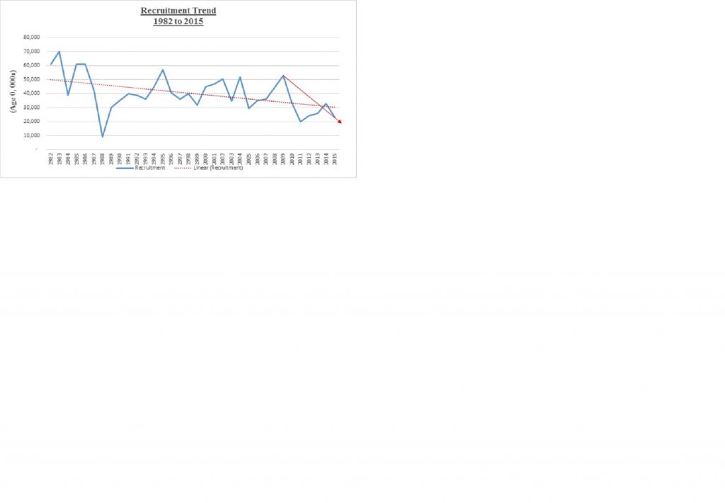 One of the graphs from Rutger's study which illustrates the relationship of length and sex for summer flounder. Graph is in centimeters, 18 inches equals 45.72 centimeters. You can see how disproportionate the relationship is between males and females as size increases to the point where almost all fish over 19.5 inches are females. NMFS's insistence on increasing size to control catch relative to this data is one of the reasons recruitment has been decimated. Combine that with the following statistics and the results are disastrous.