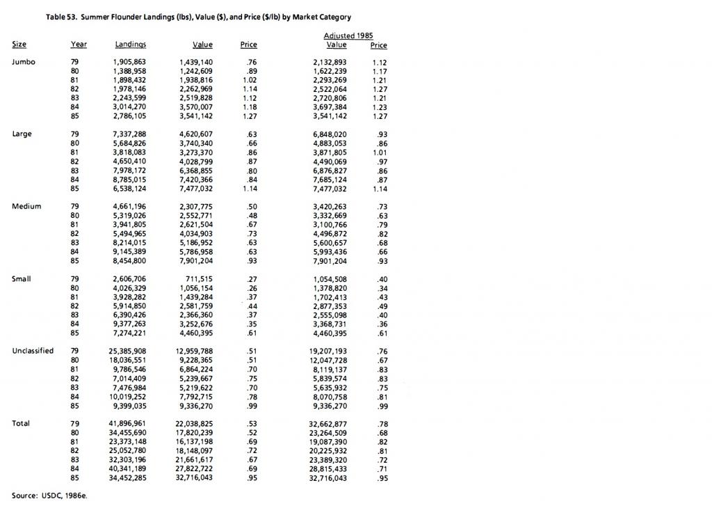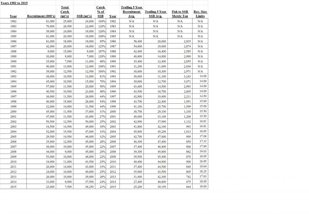 You're correct focus should and has to be on government, NMFS, ASMFC, MAFMC and any other regulatory body ultimately making policy decisions. "When we start collecting proper data and using proven science", in my opinion waiting for that to happen is the equivalent of waiting for the Mets to win another World Series, it's never going to happen and if the collection methods changed someone whose position it doesn't support would end up questioning it anyway. Precise reason I used their data from their science for my analysis and the articles published in Fisherman Magazine and RFA Making Waves, it's takes away NMFS's and ASMFC's ability to question or dispute it. There is NO DOUBT in my personal opinion what happened here. As complex as fisheries management can be, in the case of summer flounder it's obvious what's caused a decline in SSB. And since SSB and MSA thresh holds and provisions drive all decisions, question is how do we get commercial operators, recreational anglers, party and charter captains, the individual states that make up the Mid-Atlantic Fishery and fisheries management in general on the same page. Personally I don't think we need to do anything with data collection. The data whether you believe in it or not is not going to change yet the trends it portraits in my opinion make perfect sense. I know that's a bit of a contradiction but we're stuck with the data so bear with me while I connect the dots. Some more research. Check the first graph which is from the 41st SAW (Stock Assessment Workshop). Recruitment (egg production) is in (000's) and SSB (Spawning Stock Biomass) is in metric tons. Look at the relationship of recruitment to the biomass in '83 (almost 5:1), the trend from '83 to '04 and the relationship in years '03 and '04 when it drops below 1:1 for the first time ever. That trend continued it's decline over the ensuing years, drastically dropping between 2010 thru 2015 (last years data provided for in Addendum XXVlll) right after size limits spiked in 2008. Since fluke become sexually mature at the age of three, that's exactly the relationship I'd expect between recruitment and size limit increases between '08 and '10. In '15, the ratio dropped to a low of .5:1 from 5:1 in '83, so in 32-years that's a relative decline of ~90%! Compare that to the next two attachments and pay close attention to the illustration of changes in size and possession limits. The relationship of egg production to SSB started it's tumultuous decline in 2002 when limits were increased from 15.5" for recreational anglers while commercial operators maintained a 14" size limit even with substantially lower possession limits and catch quotas in place today compared to years past. Why, gender composition of the biomass with more and larger breeders being harvested was altered and egg production has been decimated ever since. Why is that, look at charts four and five regarding overall and commercial catch by age of fish. Source of these charts is from the 57th SAW. In the 80's and 90's, younger fish were being harvested because of the size regulations, look at the shift in size starting around '02 when size limits increased exponentially. In '02, SSB hit it's high water mark of ~50,000 metric tons and has since been on a steady and continuous decline because older, larger female fluke are being harvested. The data is right there for anyone to see but it's being ignored because of MSA. Rutgers "Length and Sex" couldn't support these facts more which makes it more disturbing it failed being incorporated into this latest Peer Review. That alone seals the fate of this fishery for conceivably the next 5-years unless something changes. We're too far down the rabbit hole. I found an article which I have to relocate stating in the mid 80's, ~75% of the annual harvest was made up of fish measuring in the 14" range. Today, conservatively 90% of the entire harvest is made up of fish over 18", almost entirely consisting of female breeders with significantly greater egg production capacity. That's all anyone needs to know about the "State of the Union" regarding this fishery. The last chart attached I was only able to find for the years '79 thru '85 but I'll find more current information eventually or maybe we can get some input from someone on the site with commercial experience. Look at the last column which has inflation adjusted wholesale prices for small, medium, large and jumbo fluke in '85. I assume these are wholesale prices and bear in mind they're from 33 years ago. Demand for fluke and increase in sushi demand in particular I can only assume has increased the disparity in these prices. Jumbo - $1.27 lb, large - $1.14, medium - $.93 and small - $.61. There's a 100% difference between small and jumbo which is precisely the reason I believe significant amounts of hygrading occurs at sea when you can increase your overall catch value by 100% retaining larger females and discarding smaller fish regardless of mesh sizes. In today's market with today's demand, who knows what that price differential might be. We don't have to reinvent the wheel here. We already experienced a period, 1989 thru 2002, when SSB the driving force behind basically every regulatory decision, increased from ~7,000 metric tons to ~50,000 metric tons. Possession limits were 8 for the most part with size limits ranging between 14" to 15.5". Average catch quotas were much higher than today, recruitment was much higher than it is today and SSB hit record levels. Why NMFS and ASMFC wouldn't consider re-instating those tried and tested regulations is absolutely beyond logic and comprehension. If we kept them in place and recruitment stayed healthy, commercials would be happier, recreational anglers would be happier, party and charter captains would be happier, catch quotas could be much greater and SSB would probably be at 200,000 metric tons if the trend trajectory it was on continued. MSA thresh-hold SSB for the fishery to be consi