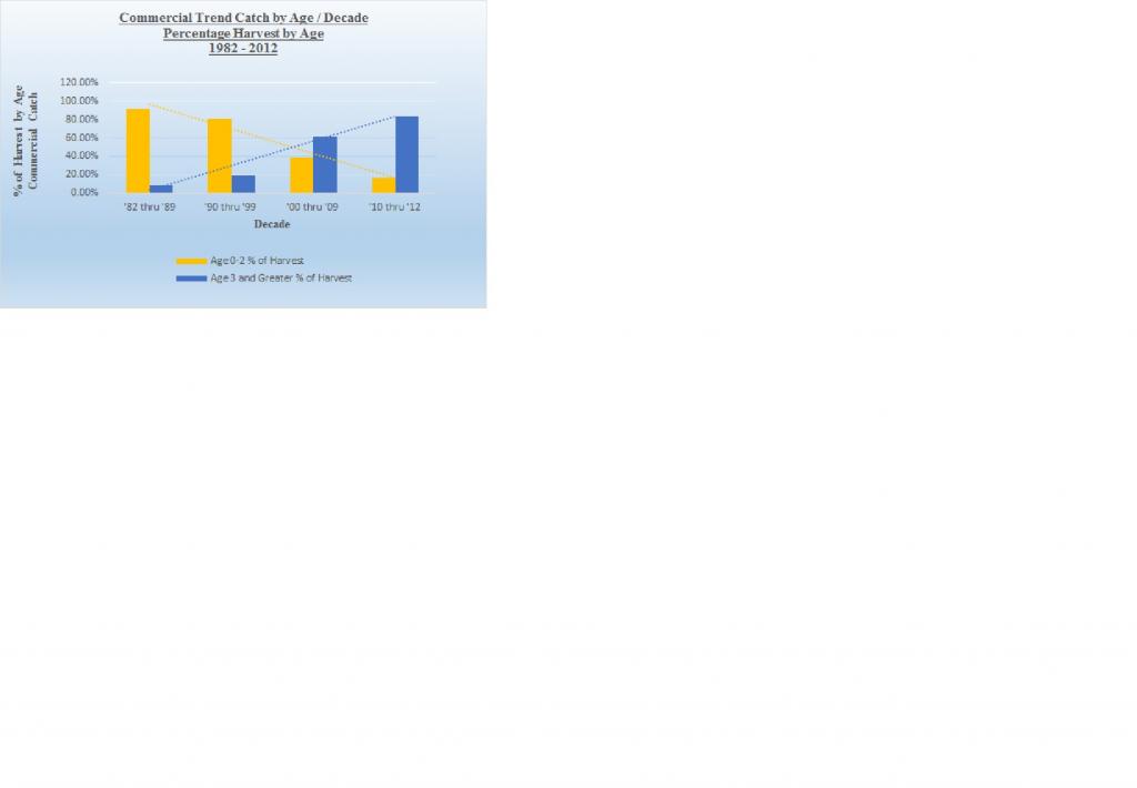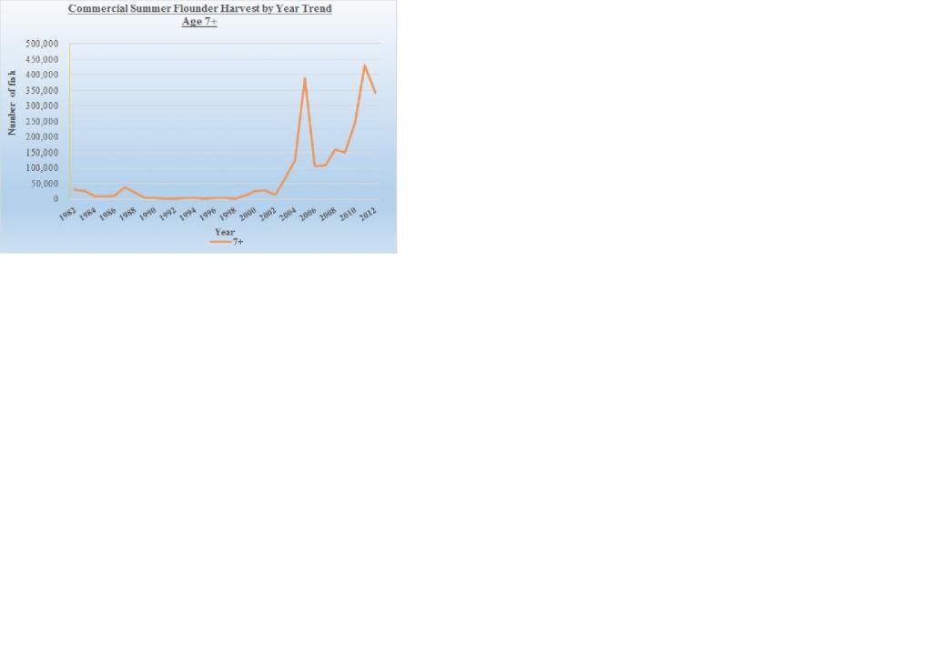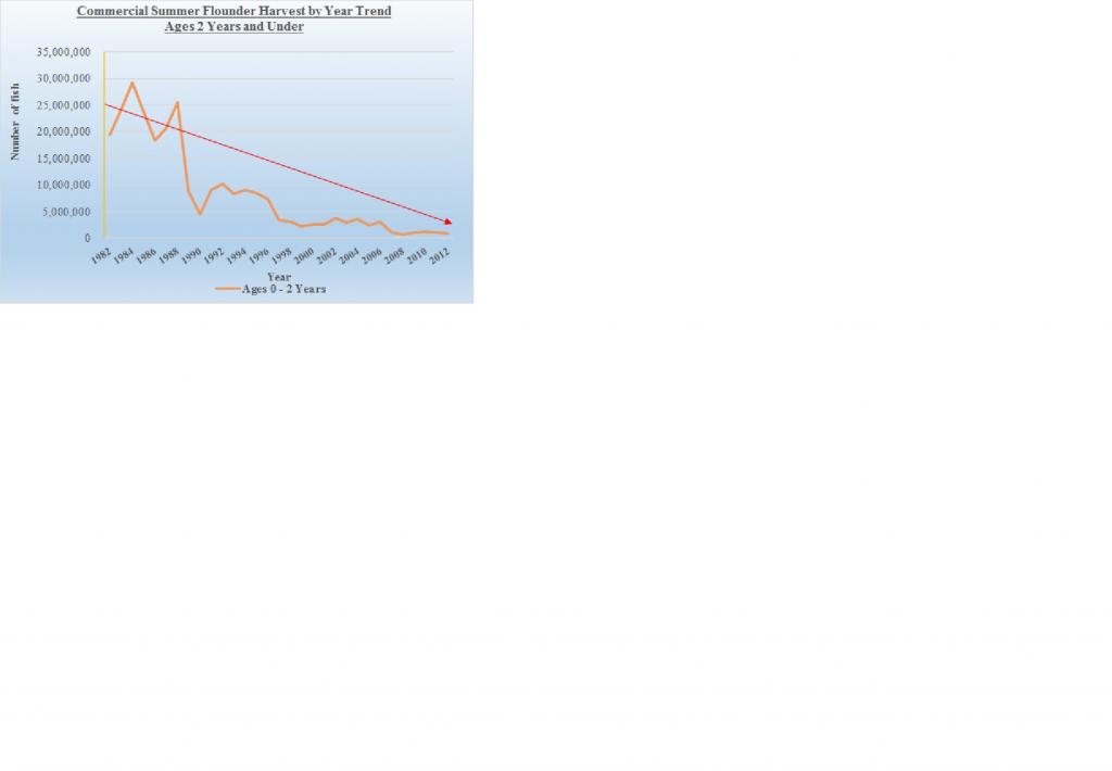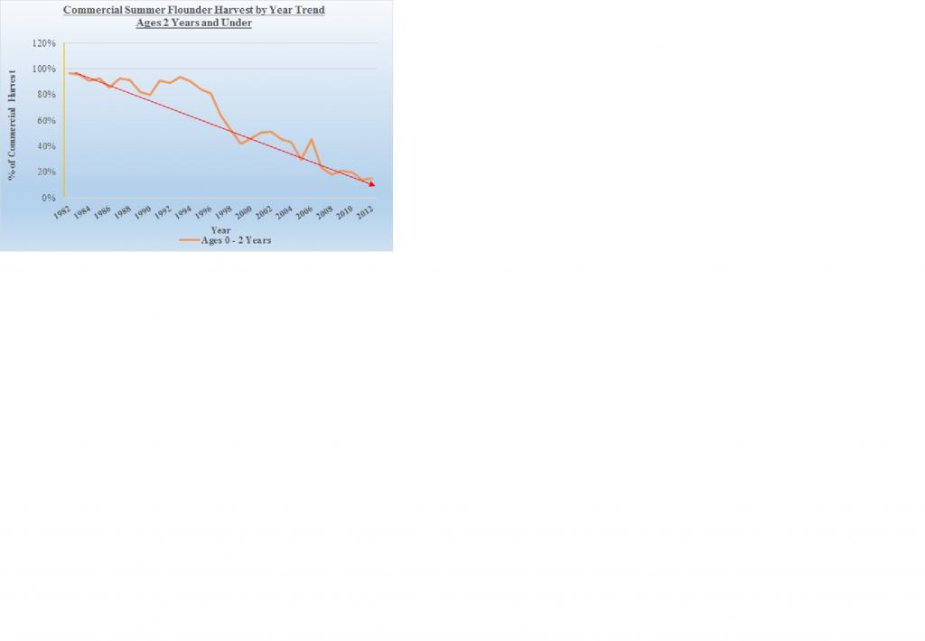 Recreational sector is not well organized but improving, not well funded but work is being done behind the scenes to address that issue as well. Put those two attributes aside, one of the most important things we can do is understand what's causing the issues within the fishery and it's decline with data to back it up. We can question the data, but it's data published by NMFS based on their own science and best we have to work with. You know by now my theory why the summer flounder fishery has declined and my view the destruction in recruitment being the primary reason caused by the continuous and unabated harvest of larger primarily sexually mature fish with a higher percentage being females. Read the articles in the attached links as it relates to size fish, age and number of eggs produced as well as Patrick Sullivan's memo dated September 22, 2015. http://www.cptdave.com/summer-flounder.html https://forums.noreast.com/17-inshor...ght-chart.html https://static1.squarespace.com/stat...nder-Model.pdf The one article mentions a 27" female summer flounder produces ~4.2 million eggs annually relative to a 14" fish producing ~460,000 annually, a key statistic impacting fishery managements philosophies. The second link states a 7 year old female flounder is ~ 24" (~61 centimeters) and the third link contains a memo from Patrick Sullivan of Cornell University which support these relationship as well as fish over 21" or ~53 centimeters being exclusively females. Rutgers study supports these facts as well. Review the attached charts regarding fish harvested over the last ~37 years, paying special attention to age of fish harvested over that time frame. First chart shows the trend of commercial fish harvested ages 2 years and under from 1982 - 2012. Notice the increase in age fish being harvested between the years 1988 and 1990, the start of a growing trend. Whats important about this chart is summer flounder ages 2 year and younger are by far sexually immature fish so fish being harvested in the 80's, while significantly higher than todays harvest, were primarily sexually immature fish with no impact on SSB and recruitment or egg production. In other words we were both recreationally and commercially harvesting smaller fish and letting the larger breeders fuel the future of the fishery. Second chart is the same information but in terms of percentages. In the 80's, 91% of fluke harvested consisted of 2 year or younger age fish, that percentage dropped to 81% in the 90's, still statistically significant in having little impact on SSB or negative impacts on egg production. Larger breeders were still sustaining egg production while smaller fish made up the larger share of annual harvest growing SSB even at heightened catch levels compared to today. Look at chart three and how all that changed when catch levels started being cut and recreational size limits started their continuous upward increases. Look at charts 5 and 6, trend for average weight of fish harvested by commercial and recreational sectors and compare those weights to the above post regarding age, sex and length in the second link and you'll see an extremely high percentage of fish being harvested today are females which is why for the last 25 years recruitment / egg production has been dropping and since 2002 SSB has been in a constant decline. Review chart 4, Commercial Summer Harvest by Year Trend Ages 7+, chart is very revealing in particular the number of fish ages 7+ harvested in years 2005, 2011 and 2012. Compare the number of 7+ year fish harvested beginning in 2003 / 2004 relative to the years 1989 through 2002. Again all this information is based on 57th SAW so numbers were only available through 2012 and doesn't include recreational but due to the size regulations in place only magnifies my point. A 24" fish converts to 61 centimeters and based on Rutgers "Sex and Length" chart are exclusively females. For the three years '05, '11 and '12, if the article that states a 27" summer flounder produces ~4.2 million eggs annually is remotely accurate, let's assume 7+ year old fish on average produce conservatively ~3.5 million eggs a year, realizing a decent percentage of 7+ year old fish in the data table are actually 8+ years and older and capable of greater egg production than 4.2 million a year. Do the math on the extent of egg production capacity being removed from SSB every year by harvesting these size fish from the biomass. Fish which were never harvested in the 80's and 90's based on catch data presented by NMFS / ASMFC. Those three years average ~390,000 fish 7+ years of age or older. At ~3.5 million eggs per fish at ~390,000 fish, we're removing approximately 1.4 TRILLION eggs annually and losing their reproductive strength every year thereafter. And, as mentioned, that number represents just the commercial harvest impacts. Since recreational average weight per fish due to increased size regulations resulted in the average weight per fish being greater than the commercial harvest (charts 5 and 6), the impact on recruitment and SSB is actually greater. Wouldn't surprise me if we're removing in excess of 3 to 3.5 TRILLION eggs alone annually from R by the harvest of these larger breeders between commercial and recreational harvest. And that completely ignores the increase in harvest for fish ages 4 - 6 years which has increased substantially as well. Compare the same information to the harvest of similar size fish between the years 1982 - 2002. 7+ year old fish over that period harvested averaged 7,638 and for the years 1989 - 1998 averaged 2,843 fish. From 2004 - 2012 7+ year old fish averaged 228,207, an ~8000% increase. 1989 - 2002 represents the time frame SSB increased exponentially by 600% based on 57th SAW or 900% based on 66th SAW. Recreational size increases coupled with increases in ex-vessel prices for larger fish caused by cuts in commercial catch quotas (supply and demand) killed recruitment and caused a steady
