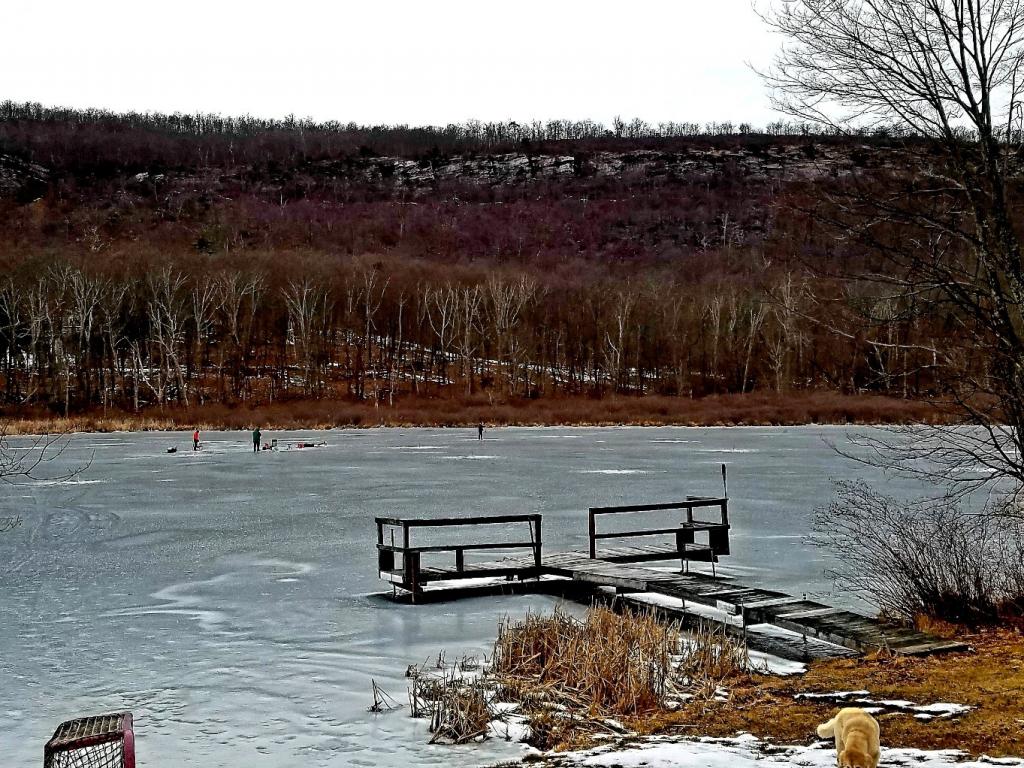 One of the best ice seasons continues into the end of February and my bet is into March. With the questionable forecast for Sunday we made the move for Saturday a few miles North as the crow flies from my lake. Both lakes still locked up solid. This one is one of the best spots with gorgeous panoramic views of the Appalachian mountain ridge. There is just something special about this spot. Great Fishing and Great People.... you know the drill. We also hit the local watering hole for fish stories and coca-colas.