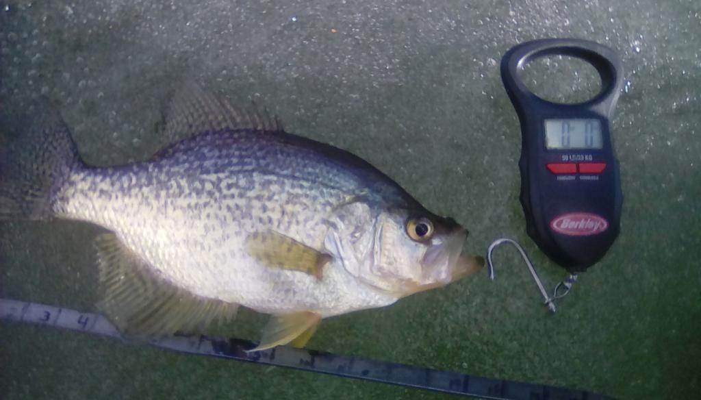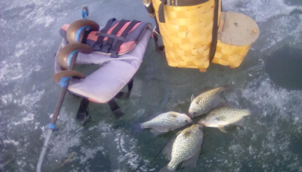 I went out on the cong today to get some crappies and found some to play with. when i went out at 9am the ice was firm not rotting on top there was 9" of ice and it was in good shape the shore where i got on was not to bad yet i did bring a plank just in case but did not need it at that time. by the time i came off the ice at around 5:30pm the ice had only a small amount of rot going on. i ended up getting 14 sunnies 8 crappies 5 perch and of course 1 friggin slime dart, seems like not a day goes by and one of those things pays me a visit. the temps are going to be a bit cooler Saturday night into Sunday morning so lets see how things go then. i kept only 4 crappies for a stir fry tonight. pics below. the crappie in the pic was 1lb 4oz..