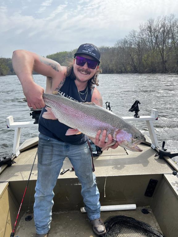 Angler fishing for shad catches close to 9 pound Rainbow trout.