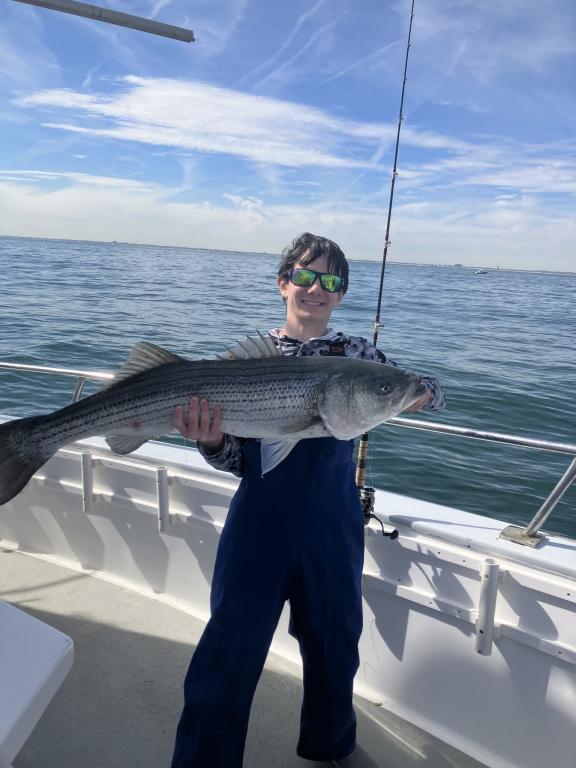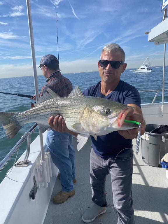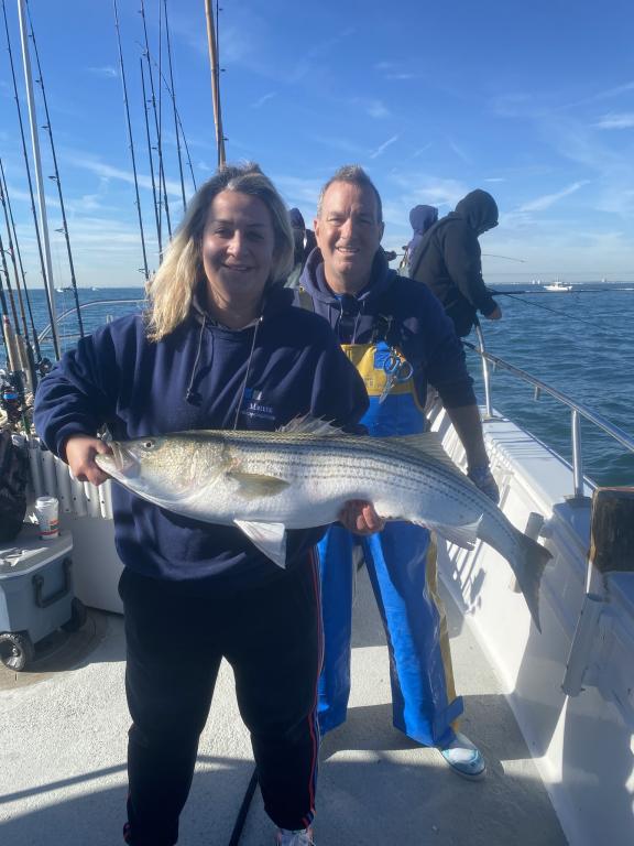 The STRIPERS were up on top today along with plenty of readings on the scope. We picked away on most drifts and tailed 2 oz. diamond jigs had the edge. The BASS were spread out over a wide area and all fish were over 31 inches and safely returned. Fishing will only get better into December so don't miss the action. Join us tomorrow as we head back out for another fun day on the water. Check the picture of Anthony with the big fish of the day at 48"! The GOLDEN EAGLE sails every day for STRIPERS & BLUES at 7:30 am from Belmar Marina in Belmar, NJ. For more information visit us at www.goldeneaglefishing.com or call 732-681-6144. |