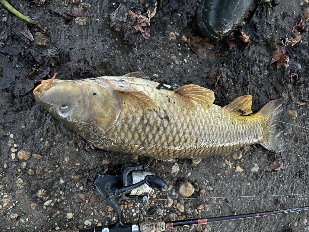 Went fishing 🎣 in 60.9 degrees Dam Site 21 this evening on a warm, sunny ☀️ day with a 30 knot south wind 💨 crosswind. Too many fishermen were there but nobody was in my fishing 🎣 spot. A fisherman who has permission to fish on the Earle Ammunition Pier showed me a photo of the big striped bass that he caught there. I gave him two of my twister tail jigs. A young Latina girl showed me a photo of the snakehead that she caught and released in the lake near the shuttered cinema earlier in the day. I threw out canned, whole kernel corn 🌽 for chum, then caught nothing while ultralight jigging. Caught and released a brown bullhead with corn 🌽 bait. On my last cast of the day, I caught a 28” 11 lb 12 oz common carp for my 15th carp catch in that spot since July. Lots of noisy Canada geese were flying late in the day. No cars were in the parking lot when I left. Fishing 🎣 in a 30 knot crosswind was very difficult. I caught carp in three different spots in the last week. The 2025 Central Jersey carp run has begun.