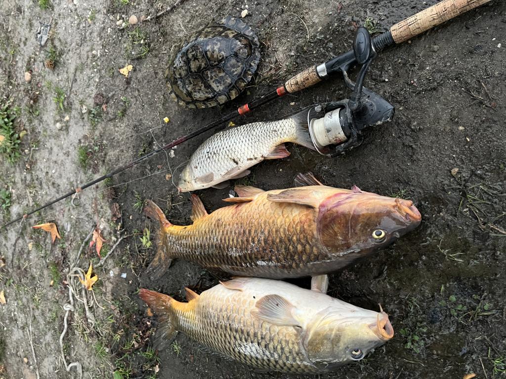 Went fishing 🎣 in 60.7 degrees Dam Site 21 this evening on a cool, sunny day with a strong south wind. Too many fishermen were there again but I beat one to my spot. Threw out Walmart canned whole kernel corn 🌽 for chum, then caught nothing while ultralight jigging again. Landed 2 9 lb 14 oz and a 1 lb 12 oz common carp, a 13” brown bullhead and a redeared slider with corn 🌽 bait. On my last cast of the day, when I lifted my rod to reel in and leave, the small carp was on the end of my line. Some carp bites are not detectable. While walking back to my car 🚗, I made a video of the Canadian Canada geese. I caught 70 carp and 91 turtles 🐢 this year.