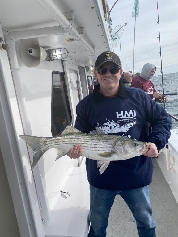 There was a big body of fish to work on and we had great action with numerous STRIPERS on around the boat at once. They were all on 4 oz. tailed diamond jigs.