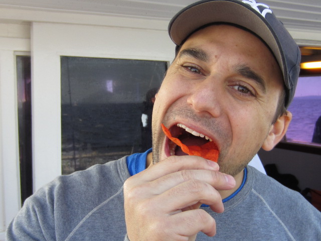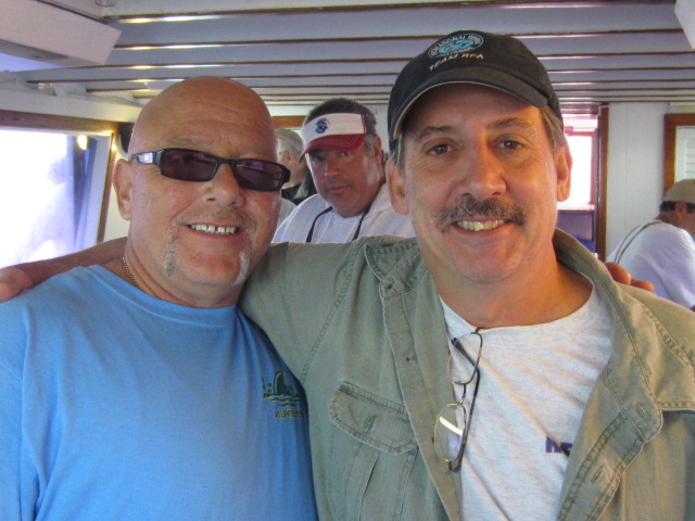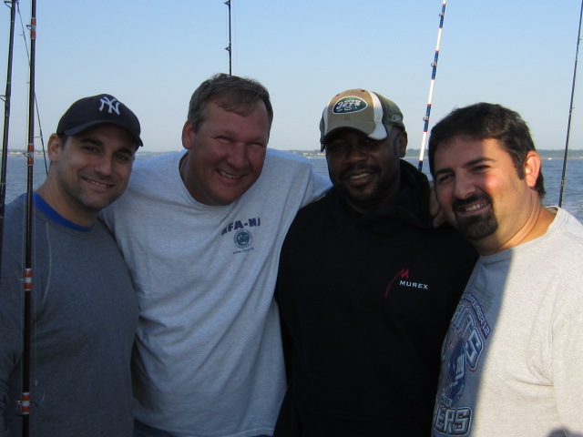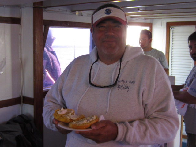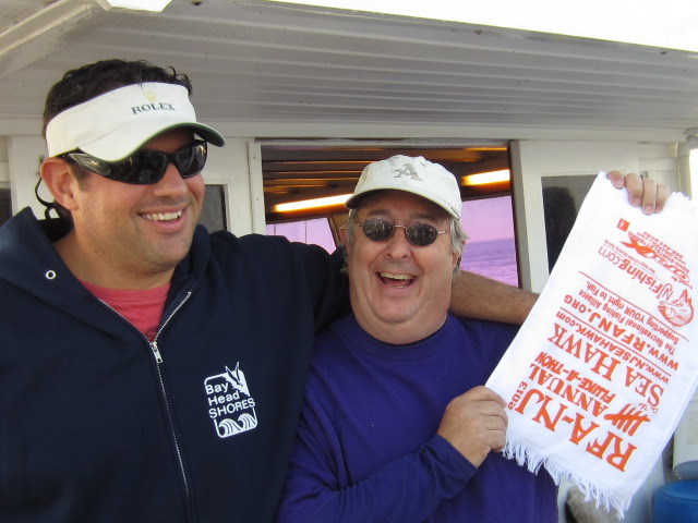 First off hats off once again to Dave and Fran for putting this together and obviously bringing together a fishing brother-hood which is top notch all around. As Joey Day Fish would say "this spots sucks" was the communal chant around the stern but that was obviously no slight to captain Mike or the Sea Hawk mates as we traveled the entire bay looking for the right bite. Dirty water and wind against were challenging all day and Mike bumped us in and out of gear all day to get the drift going artificially. The fluke just didnt want to cooperate, and when that happens well you know the ball busting comes out in true form. Real thick skin in the back of the boat all day...non stop chop busting and lattes all afternoon. Low and behold I did win the dollar-YO$ fish and luck might have it this measly 3.5#er wound up taking the pool too. Cuz from Staten Island took the double down dollar YO which I think Larry and Mike contributed $3-4 a piece on as shorts counted against ya. Can't say enough about the guys that I have met over the years and some new faces that have showed up lately. Gdubs always a pleasure, heard a few googan Georges went on up there but Tropics def kept you in check. Always great seeing Tropics, Sammy, Larry, Shrimpy and Vintastic.. guys make the trip an adventure. YOU will see from Steve's lack of posting and overall photogenic nature it was a tough day for him not boating a single living creature so I had to give him the man hug to let him know we are all still there for him. Anyhow few pictures to pass around, the usual suspects enjoying what they do best especially FRAN... guy loves food LOL -- we love ya franny cakes..BTW I put about 10 almond joys in your tackle bag for the ride home. The sandwiches as always top notch, there was def no shortage of food or liquids on this boat and I think although the fishing wasnt up to par (I mean cmon it was an RFA trip no one actually comes/expects to catch fish) it was a beautiful Saturday spent in great company. Enjoy the photos...