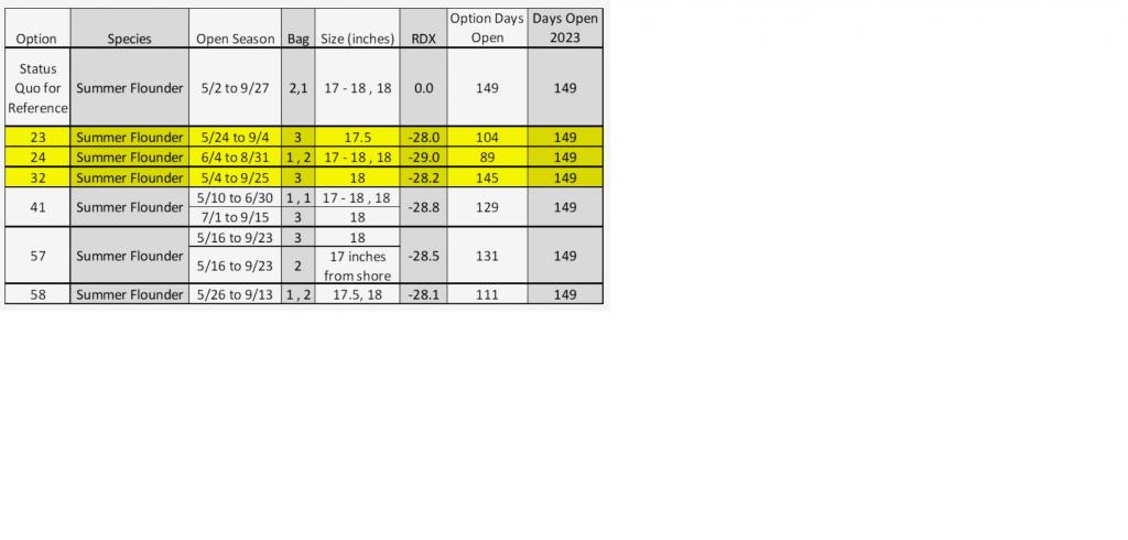 Someone help me understand the logic here. Option 32 is 3 fish at 18" for 145 days. Option 24 is for 3 fish, one a micro slot again between 17" and 18" and 2 over 18" with a 89 day season or 56 days less of fishing effort or an ~40% shorter season. EVERYTHING about recreational catch and MRIP is based on fishing effort so we have 56 days less fishing effort, same possession limit albeit one fish a slot and the projected reduction in catch is higher for option 24 by only 8/10th of a percent from 28.2% to 29%!