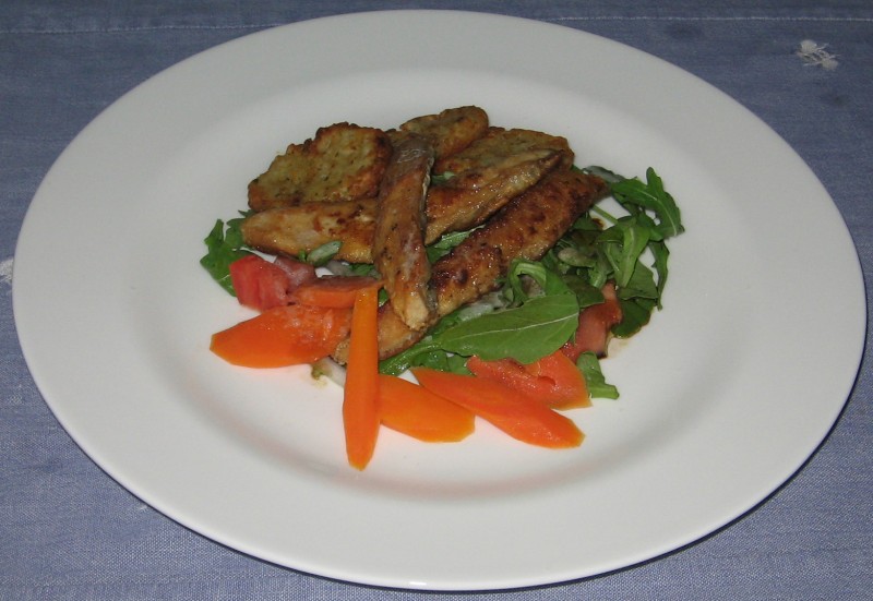 Dredge boneless Mackerel Fillets in flour, pepper, salt , pepper and paprika.