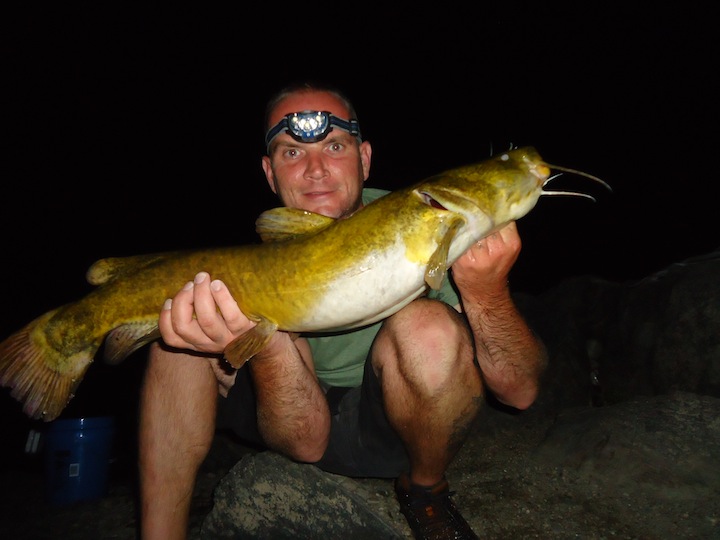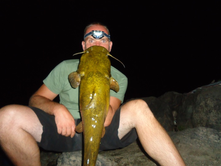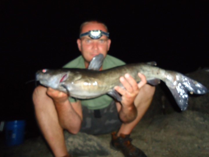 Hit the big river last night prepared to do battle with some river monsters. I was in it for the long haul. I brought my tent, firewood, sleeping bag, food and enough beer for 3 people. I was the only soldier out on the ROCK last night and I couldn't of been happier. Made bait and started fishing around 530-6 pm. Cats were on the prowl last night, 1st fish was a channel @ 2.5 lbs that inhaled a 5 inch Gill. That was around 630, after that it was pure mayhem, rods were flying in the river and I jumped in after them. Next 3 cats were all Channels in the 4-5 lb range, good eating size. 9 pm, something picks up my hacked up live Eel, set the hook, FISH-ON, YEA BUDDY!!!! Feels like a good fish and its peeling drag like a freight train. Got the beast in, YES, Channel weighing in @ 11 lbs 6 oz. Oh yea, now I'm fired up. Got 1 more 5 lber after the beast around 930. Than it slows down, still getting hits and run-offs but the fish weren't inhaling the bait like they were earlier. 1030, lines slowly peeling off the reel so I open the bail to make sure this fish can have his way with the bait. The fish stops so I reel in the slack and go to set the hook......................... FISH-ON!!!! Feels like another beast, drags screaming off the reel again. Finally after pulling her out of the rocks and almost going for a swim, the beast is landed. Flathead, my biggest one so far, weighed 9 lbs 11 oz. What a fight!!! This fish did not want to come in. Unbelievable fishing last night with 9 Cats landed, 8 Channels and 1 Flathead. Action died off around 11 but I stuck it out til 2 just to see if anything else wanted to come out to play. Went to camp, set a fire, had a few more beers and just sat in my camp chair smiling. I had this spot to myself all night, does life get any better? WOW! GOOD TIMES!!! TIGHT LINEZ!!!