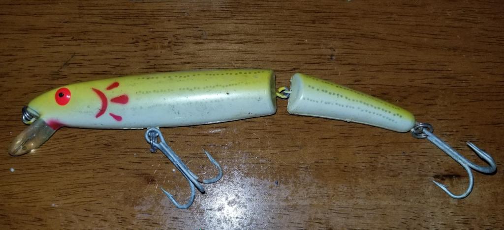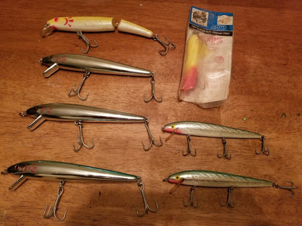 1 used saltwater long A jointed bomber in chicken scratch 2 once used but too new looking to really tell 6 inch rebel minnows in blue chrome 1 brand new, never used Atom Striper Swiper popper in red/yellow 1.25 oz. $40 for the entire lot.