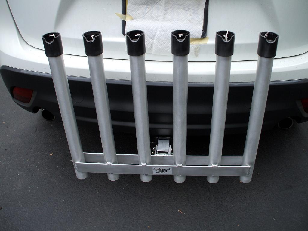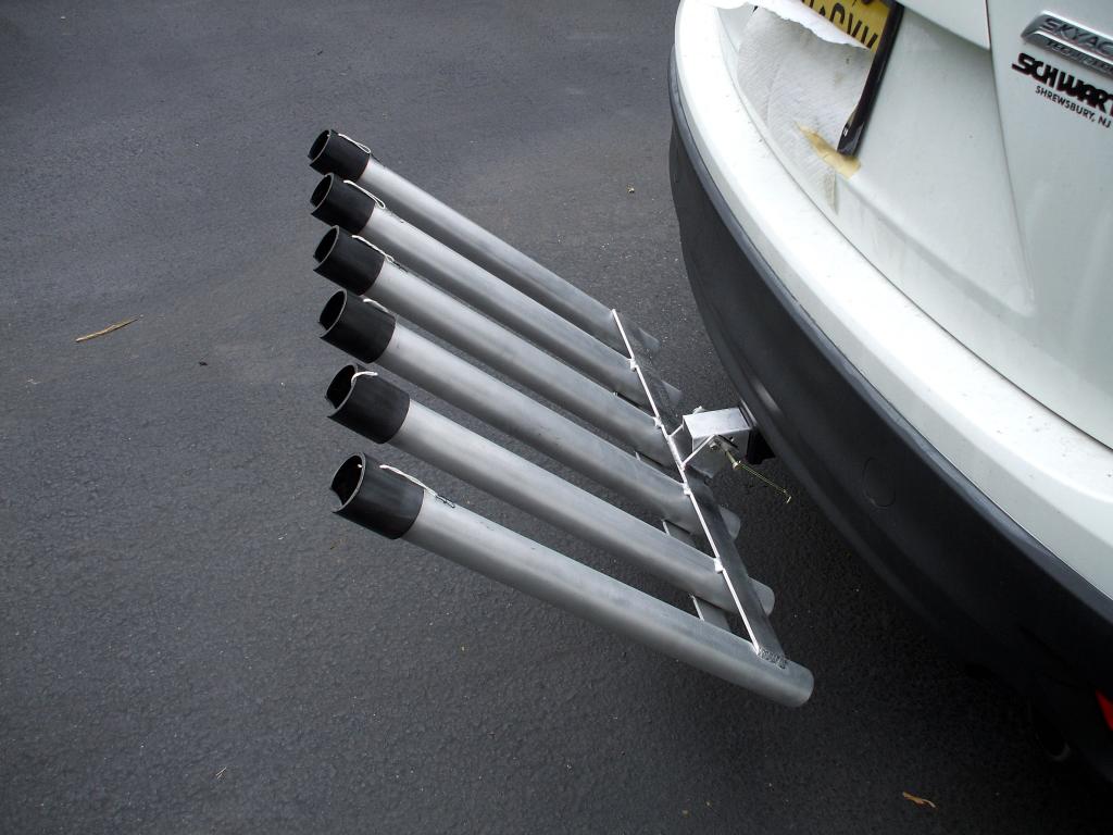 6 rod adjustable rod rack. It can be adjusted to tilt forward so it would not interfere with tailgates or hatchbacks. Each rod holder is 25” long and fits a 2” receiver. Middletown/ Sandy Hook area. Price $150. Used less than one season.