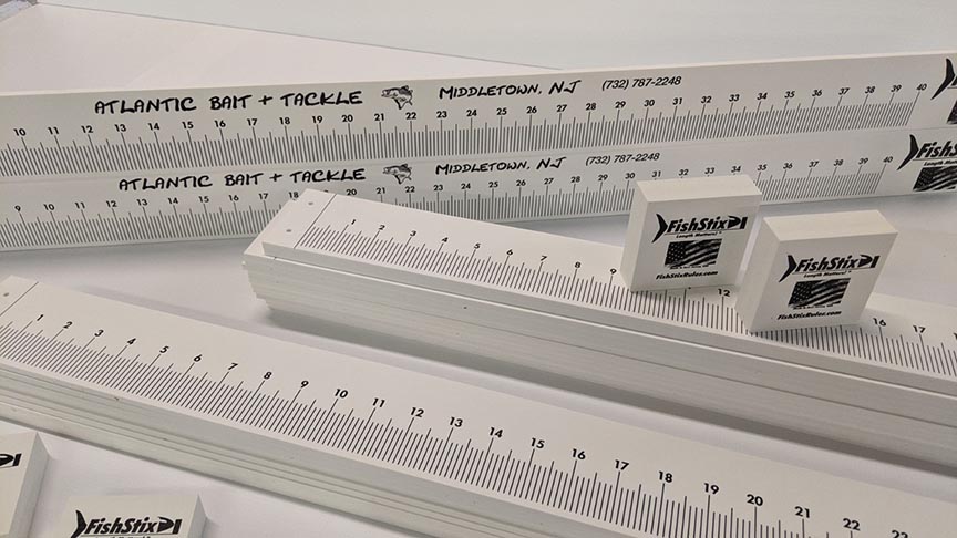 Convenient nose bump to place the fish against and a ruler out to the distance indicated by model number. ALL models have have the logo on the fish nose bump & the tail end. Our newest addition is our FS 20K...Kayak version...it has a drill hole on the far right to allow it to be lashed to your kayak for safe keeping. BUT if it does go overboard, remember...they FLOAT! It is also shorter and more portable for those interested in a more compact unit. All sizes are in stock. • 20 inch (FS 20K) $11 each • 30 inch (FS 30) $14 each • 40 inch (FS 40) $17 each • 55 inch (FS 55). $20 each These are made from ABS with stainless steel screws. **Some assembly may be required. Ask for them up at your local tackle stores. Pete at AB&T just received his shipment! OR Price is plus $8.50 shipping & Sales tax. PM or EMAIL: fishstixruler@gmail.com Keep em legal & put the shorts back to swim another day! We will be sponsoring the Sandy Hook Bay Anglers Fluke tourney as well as the Triple Challenge Series this year! For those retailers interested: ALL models are customizable for promotional purposes in single or full color imprint with a minimum of 12 units for a single order. Every time someone uses this product to measure their catch, YOUR LOGO is in front of them. How many imprints or views is that per day? What is that Value Worth to you? PM or email me directly for more info about customization and wholesale purchasing info. ALL MADE IN NJ! I also have to give props to my buddy in NW Florida for the pics with the Redfish!