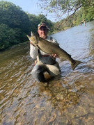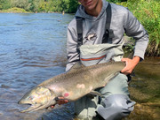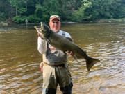 Made the run up north this weekend bolted up to fish for the day Saturday with scoward & my bosses son james. On the river at 3:30 am holding our grounds patiently waiting for the sun to come up. We started off mid river trying to stay ahead of the big push of cohos that came thru the day before down low. We hooked a few up there but not a ton. Guys in the shallow stuffdownriver made it tough for the fish to run so we looked else where. Took a ride to a nearby creek saw a few dead ones and one live one. Shot back to the river and went to a old stopping ground spot and found em good coming through the hole. Hooked a bunch lost a bunch close to fifteen hookups for myself with a few hos that snapped the 8 lb leader. James was able to stick his first king pretty cool to watch the kid. Looking forward to the big trip up with the crew in a few weeks.