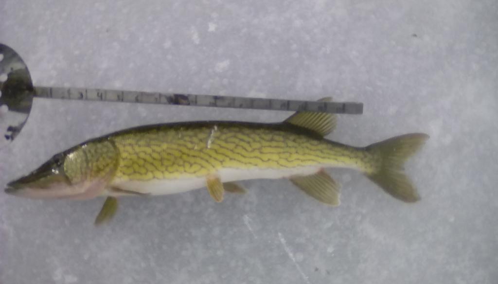 I went to big swartswood lake today and found the lake down about 4ft, the ice was 10 " where i was fishing and there was about 9 other anglers fishing the lake in different spots. It was jigging only for me today. I fished 14' to 6' i found some fishable weeds in 8' and that is where i got 5 slime darts and one perch on a #4 rippin rap. I did get one small slimer on the marmooska and meal worm jig but they did not want that today. one of the pickerel was a "HAMMER" at 20 inches. the other ones were average size.the perch was 10" all fish were released to fight another day. here is a pic of the biggest slimer.