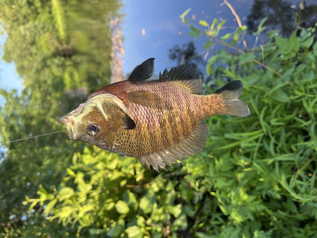 Went fishing 🎣 in 82.4 degrees Gropps Lake yesterday evening on a hot 🥵, humid, sunny, day with no wind. The hundred degrees weather last week turned the vegetation from green to brown. My fishing 🎣 spot was covered with moss so I threw it onto the shore before I started fishing. Threw out canned, whole kernel corn 🌽 for chum, then caught nothing with corn 🌽 bait. Caught and released 2 bluegills to 8 with a 1/32 oz twister tail jig on 2 lb test line. Also caught and released a 23 4 lb 9 oz channel catfish with my homemade corn meal bait on an old Mitchell #300 spinning outfit. Saw 8 fishermen catch nothing. Mosquitoes 🦟 were biting. Killed 2. An osprey, 4 rock pigeons, a great blue heron, a double crested cormorant, and swallows flew nearby. A cottontail rabbit was in the parking lot when I left. Took pictures. A few fish were jumping. My friend Ross caught tuna today.