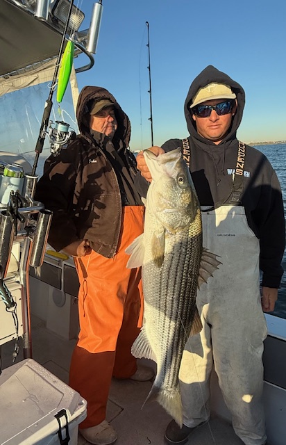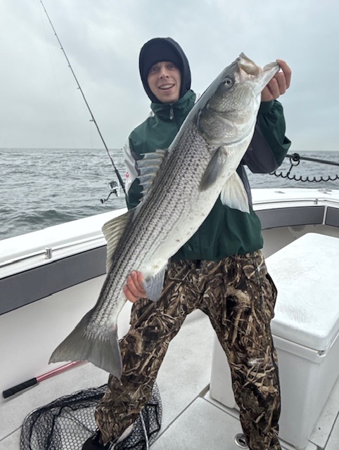 Saturday we were able to get one last trip in before the blow for Dave and crew. Got the guys into a good bite with bass blowing bunkers out of the water. Guys went to work with shads and live baits landing several quality fish up to 46”. When the bite slowed up we took a ride and finished the day with a great live bait bite landing another dozen plus fish and losing a few more.