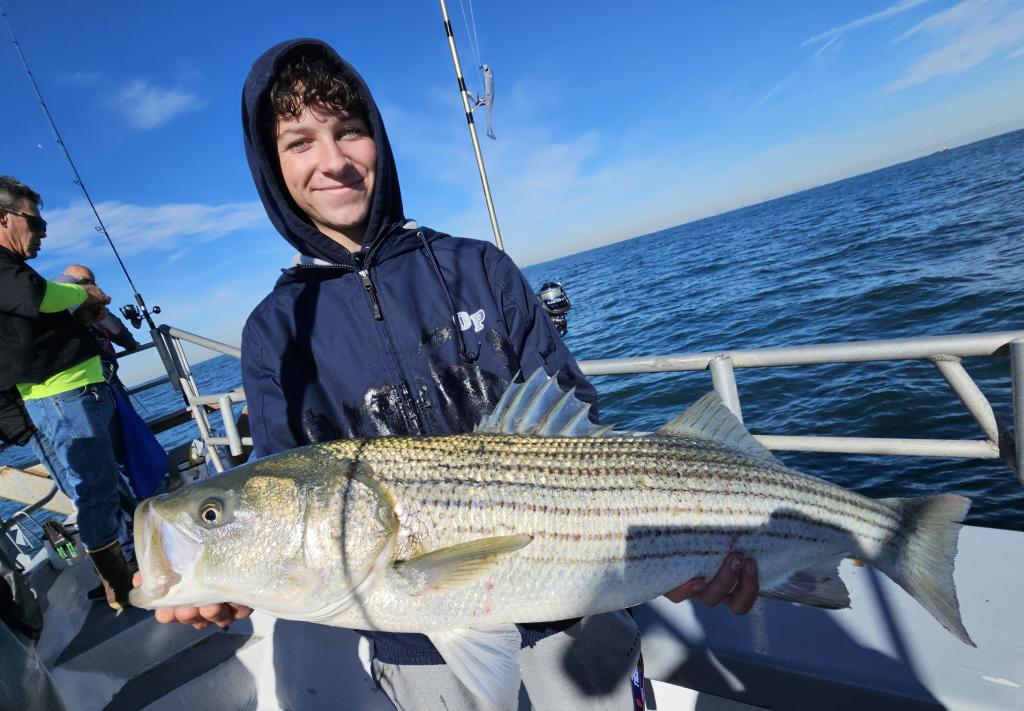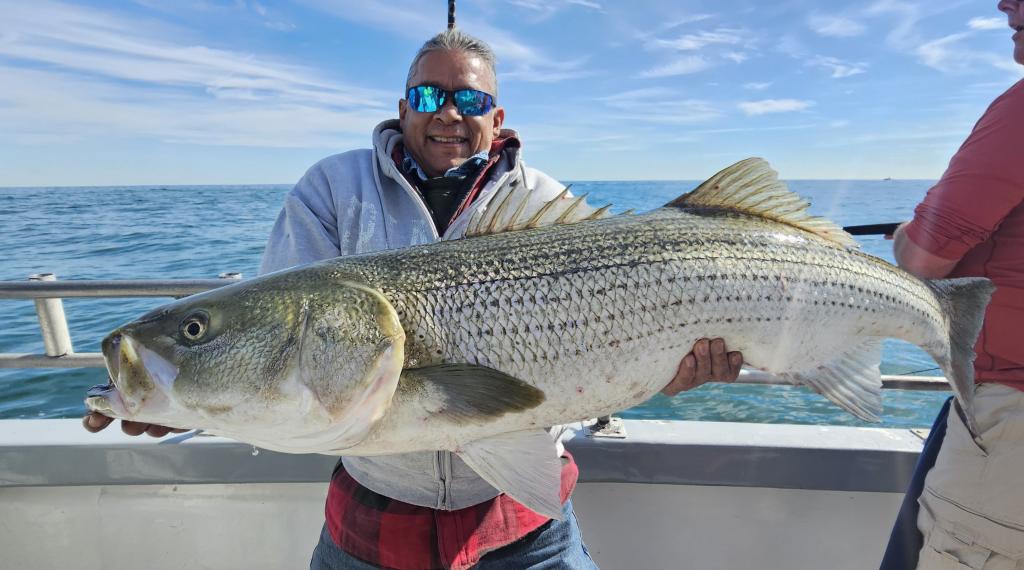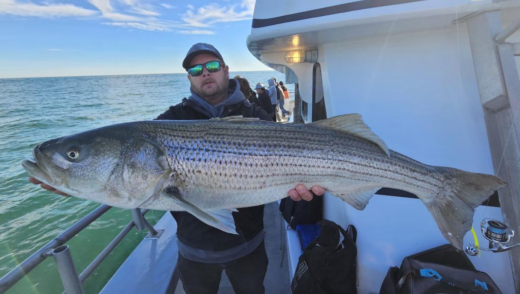 THE FALL RUN IS ON!!!!! Steamed out this morning with another sold out crowd on our first fall daytime bass trip. Wasn't sure what to expect with all the poor weather we've been having, so knew we were going to have to do some looking. Put a bunch of miles in, looking in a few different areas before we found what we were looking for. Miles upon miles of JUMBO bass feeding on top. They moved fast and were a little tricky to catch at times but when we got in them it was game on with the diamond jigs. Kept on their tail until they staged up in one area in the early afternoon and started feeding better. Had a bunch of drifts with multiple fish on at a time. Tailed A47 diamond jigs worked the best today, color didn't really seem to matter. Everything caught today was too big and was safely released. Here's a couple of the pictures from today, I'll post more as the guys send them to me. For the first day of our fall bass season, I'll take it! It should only get better from here. We have plenty of room tomorrow! Again, be ready for anything. Bring the diamond jigs as well as the shads! Sailing 7:30AM-2:30PM DAILY for Stripers 2 Simon Lake Dr Atlantic Highlands NJ Open boat, limited to 35 passengers. Walk-ons welcome provided we have room. Secure your spot now at fishdarkhorse.com or call/text 973-440-0335 10/19 Back out this morning with another good crowd of guys looking for their shot at some bass. Knew the forecast was iffy from the start, but when that stiff SE wind hit us within minutes of leaving the dock I knew it wasn't going to be nice where we fished yesterday. Decided to take a steam in a different direction where it would be much nicer. Bounced around seeing some bites, but never fast. Couple of overs, a keeper and a bunch of shorts by the end of the day all on shads. Took a look around our local waters towards the end and found some absolute mother load readings. Thought we hit the jackpot until we stopped the boat and they wouldn't bite, over and over again. Even had them come up on bait a few times and still wouldn't eat. Very frustrating to say the least. Not sure if it was a tide thing, or just a brand new batch of fish moving into the area and just haven't settled in yet. We'll have to wait and see! The forecast for tomorrow looks brutal, much worse than today. With that being said we're going to take a pass on tomorrow and head back out on Tuesday. Tuesday looks good right now with some much needed west wind.